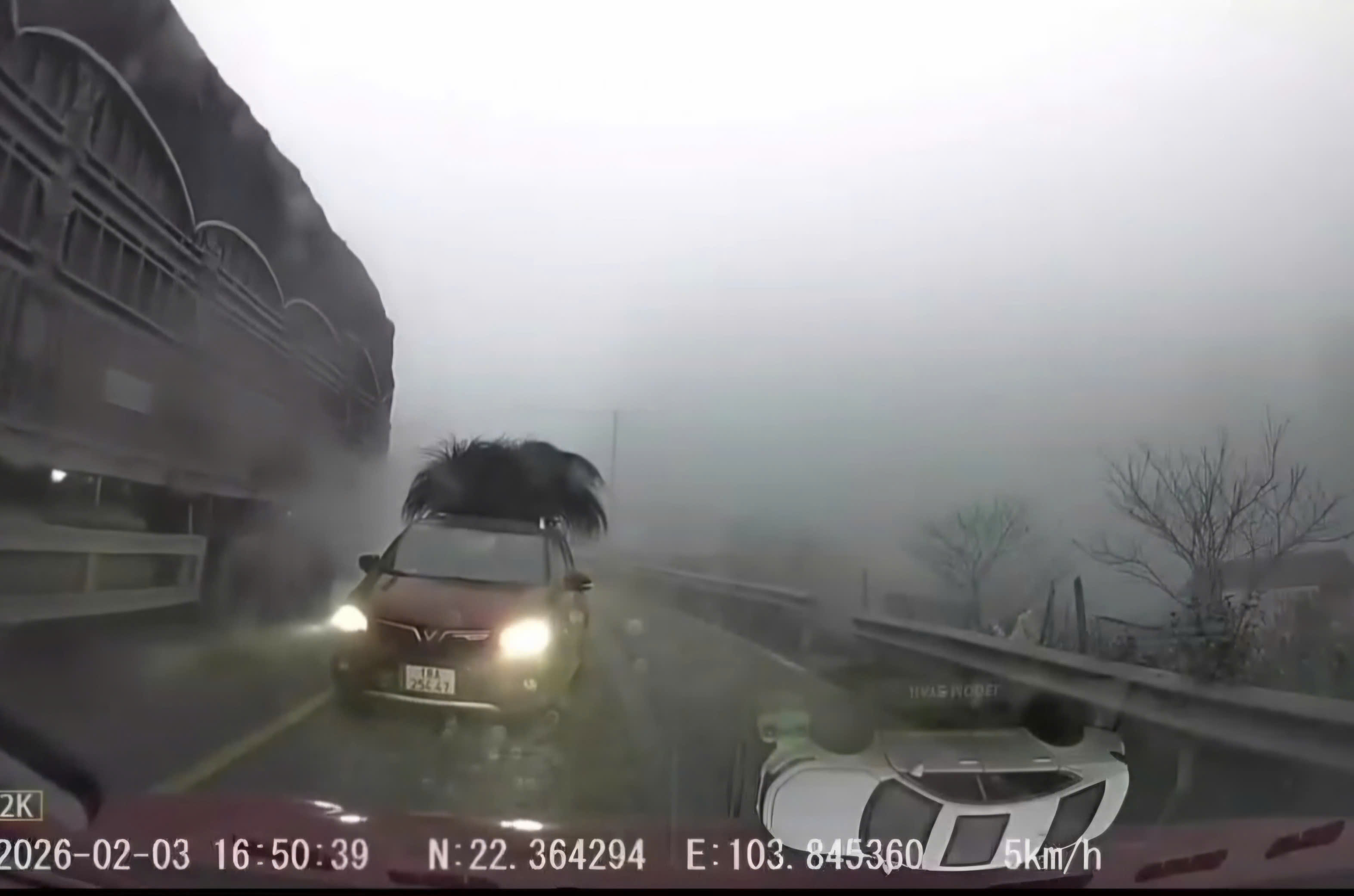 Đoạn clip cho thấy chiếc ô tô con vượt xe trong điều kiện trời sương mù dày đặc, tầm nhìn hạn chế, tiềm ẩn nguy cơ tai nạn nghiêm trọng cho các phương tiện đang lưu thông trên tuyến đường đèo.