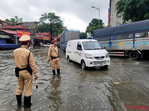 Cán bộ Đội CSGT số 2 (Phòng CSGT Công an TP Hà Nội) bố trí cán bộ ứng trực, hướng dẫn các phương tiện di chuyển qua điểm ngập, tránh va chạm với vật cản còn nằm trên đường.