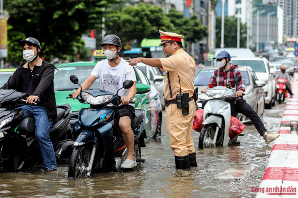 Trong những ngày mưa bão vừa qua, nhiều CBCS CSGT đã phải ngâm mình trong nước nhiều giờ đồng hồ, đôi bàn chân bị nước ăn trắng bợt, rớm đỏ vì lạnh. Có những chiến sĩ gia đình cũng chịu ảnh hưởng nặng nề do mưa bão, nhưng gác lại nỗi lo riêng, họ vẫn cùng đồng đội xuyên ngày, xuyên đêm tổ chức phân luồng, điều tiết, bảo đảm an toàn giao thông và hỗ trợ người dân vượt qua khó khăn. Trong ảnh, cán bộ CSGT Hà Nội làm nhiệm vụ tại khu vực ngã ba đường Cầu Bươu - Xa La.