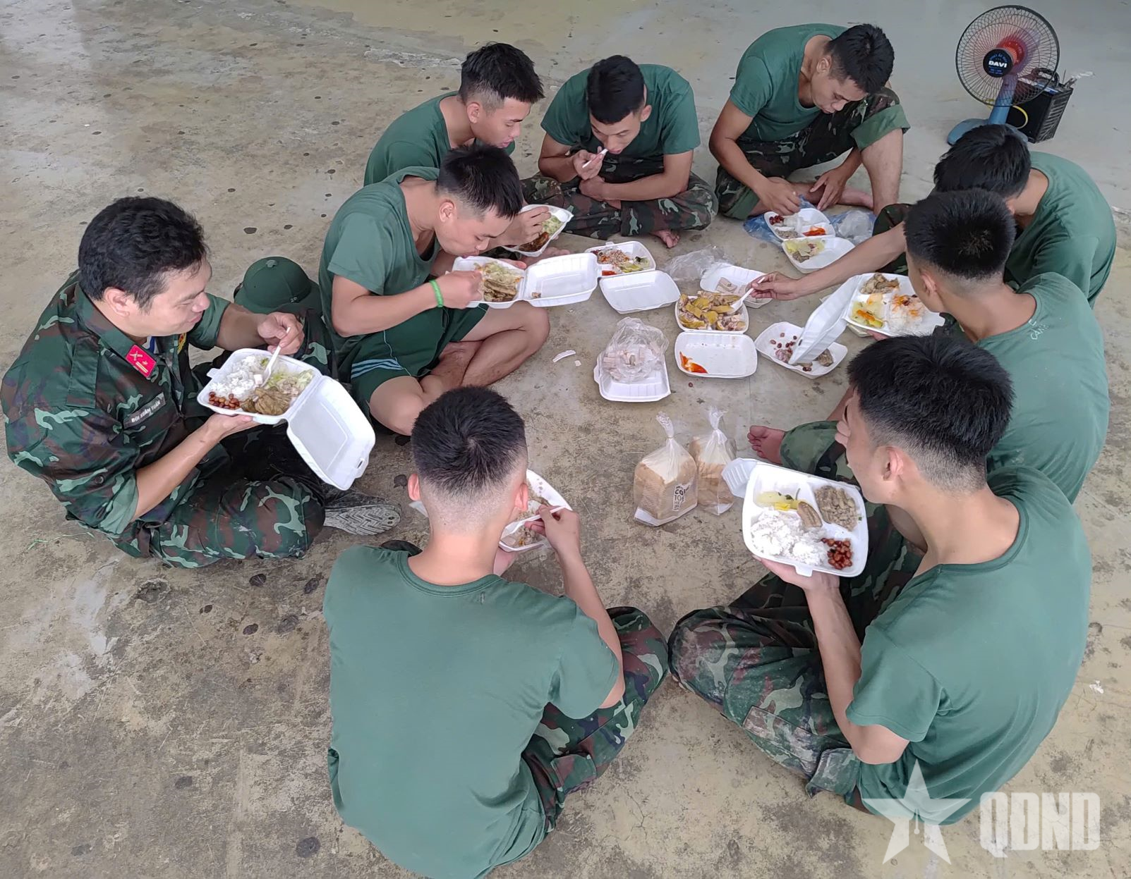 Bữa cơm trưa của bộ đội Tiểu đoàn Chỉ huy Pháo binh 13 (Bộ Tham mưu Quân khu 1) tại hiện trường giúp dân dọn dẹp sau lũ.