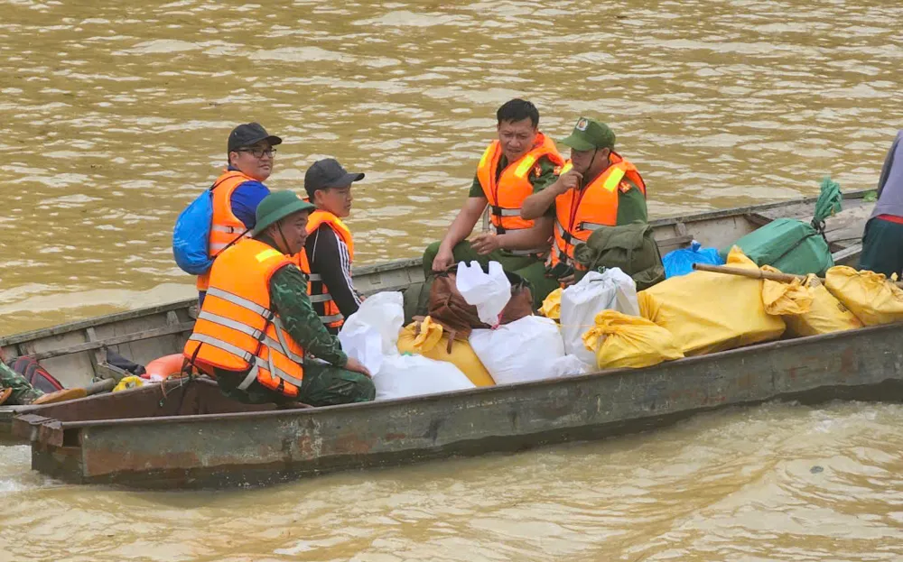 Công an vượt lòng hồ thủy điện mang lương thực, nhu yếu phẩm đến người dân. Ảnh: CA