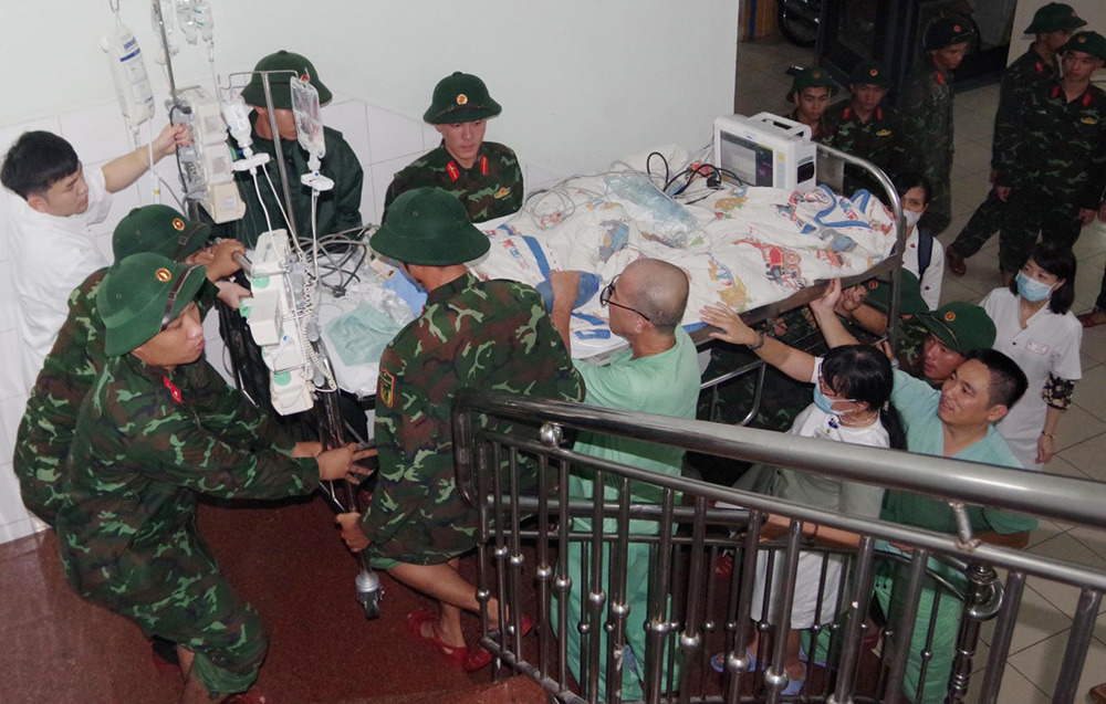 Tại Bệnh viện Trung ương Huế, nước lũ dâng cao, tràn vào tầng 1, đe dọa an toàn của hàng trăm bệnh nhân và hệ thống máy móc, thiết bị hiện đại. Nhận thông tin, Bộ CHQS TP Huế đã điều động cán bộ, chiến sĩ nhanh chóng cơ động đến bệnh viện, phối hợp cùng y, bác sĩ ứng phó. Lúc này, trời mưa xối xả, nước tiếp tục dâng cao... Trong khuôn viên của bệnh viện, cán bộ, chiến sĩ LLVT gấp rút sơ tán người, cứu tài sản. Bộ đội, dân quân cõng từng bệnh nhân nặng, đẩy người bệnh trên xe lăn, khiêng giường bệnh, máy thở, bình oxy, thiết bị y tế lội bộ qua các dãy hành lang ngập nước... Thạc sĩ, bác sĩ Phạm Kiều Lộc, Phó trưởng khoa Hồi sức tích cực-Cấp cứu Nhi, kể: “Lần đầu tiên tôi thấy nước dâng nhanh như vậy. Trong bệnh viện có rất nhiều bệnh nhân nặng và các trang thiết bị đắt tiền. Rất may, các anh bộ đội kịp thời hỗ trợ, giúp chúng tôi giữ an toàn cho người bệnh trong thời khắc khó khăn”.