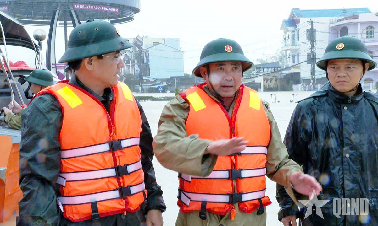 Đại tá Phan Đại Nghĩa, Phó tư lệnh kiêm Tham mưu trưởng Quân khu 5 (người đứng bên trái) và Đại tá Nguyễn Thế Vinh, Chỉ huy trưởng Bộ CHQS tỉnh Gia Lai (người đứng giữa) kiểm tra, nắm tình hình các vị trí ngập lụt.
