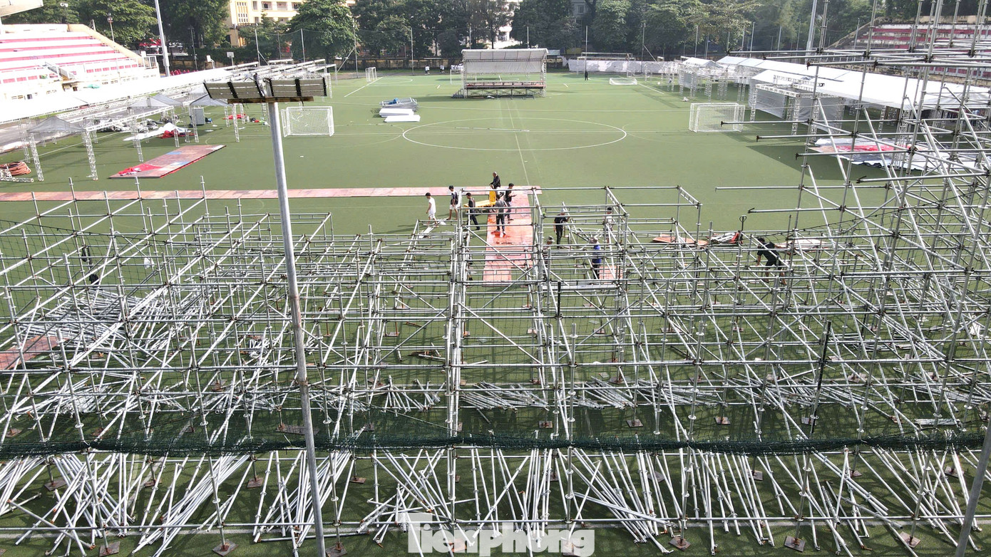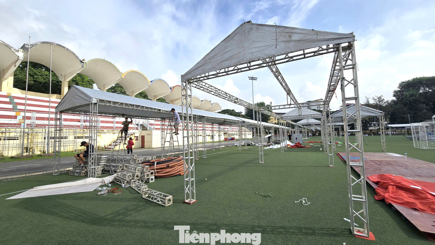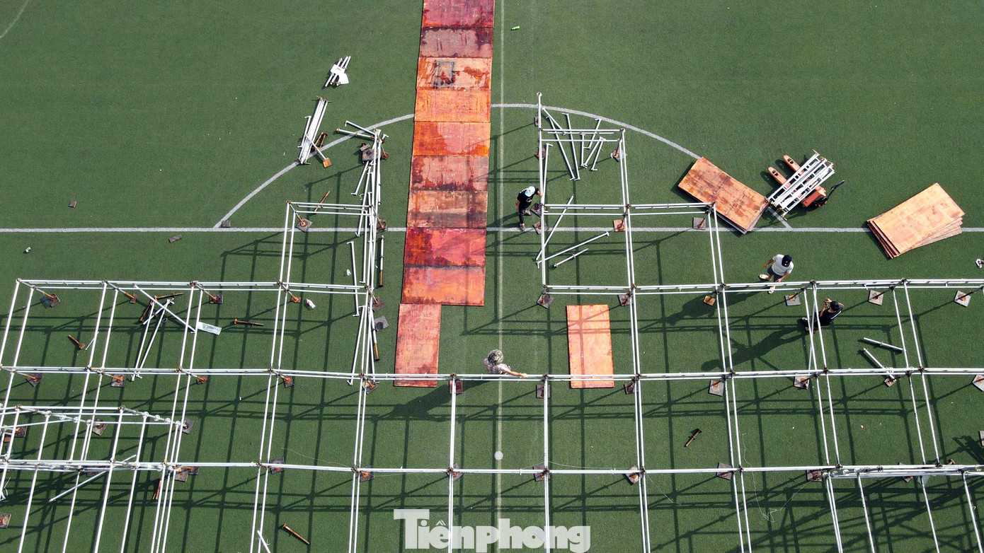 Dưới tiết trời oi bức (ngày 15/10), tại sân vận động Đại học Bách khoa Hà Nội rộn vang tiếng máy cắt, tiếng khoan điện, tiếng của các thanh, khung kim loại va chạm hòa cùng tiếng trao đổi công việc giữa các tốp nhân viên thi công…