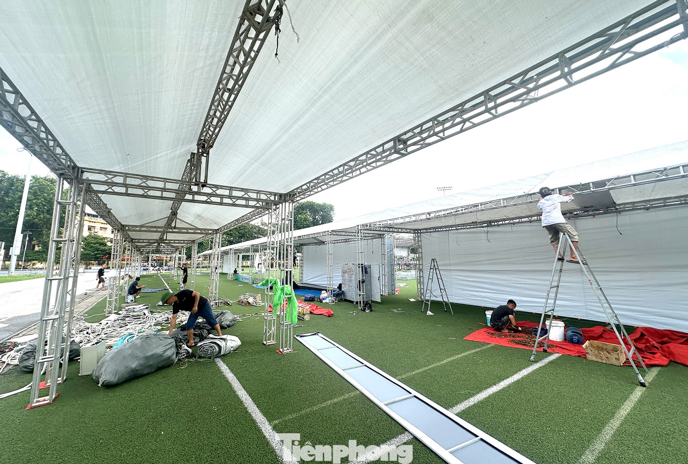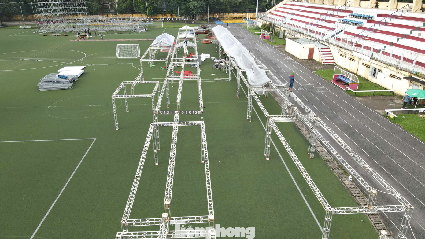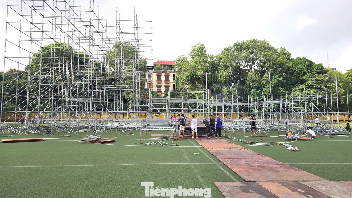 Dưới tiết trời oi bức (ngày 15/10), tại sân vận động Đại học Bách khoa Hà Nội rộn vang tiếng máy cắt, tiếng khoan điện, tiếng của các thanh, khung kim loại va chạm hòa cùng tiếng trao đổi công việc giữa các tốp nhân viên thi công…