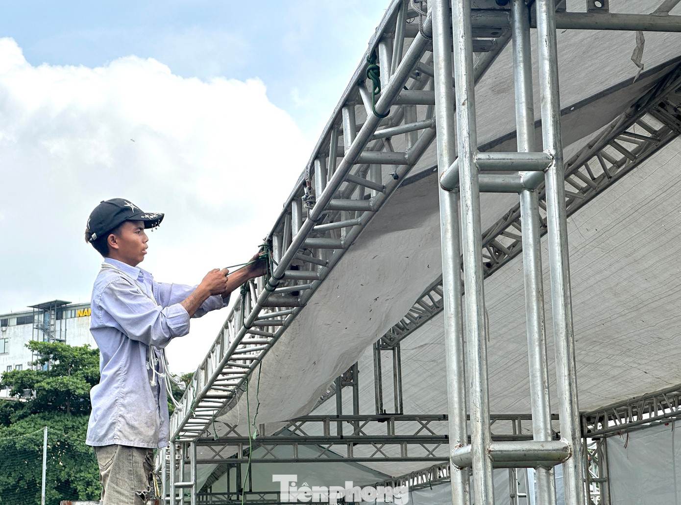 Anh Cao Đức Chính - giám sát kỹ thuật khu vực sân khấu, cho biết công việc đã bắt đầu từ 14/10. Dù gặp thời tiết bất lợi đầu buổi sáng, nhưng ngay khi ngớt mưa, đội ngũ 15 người đã khẩn trương bắt tay vào việc.