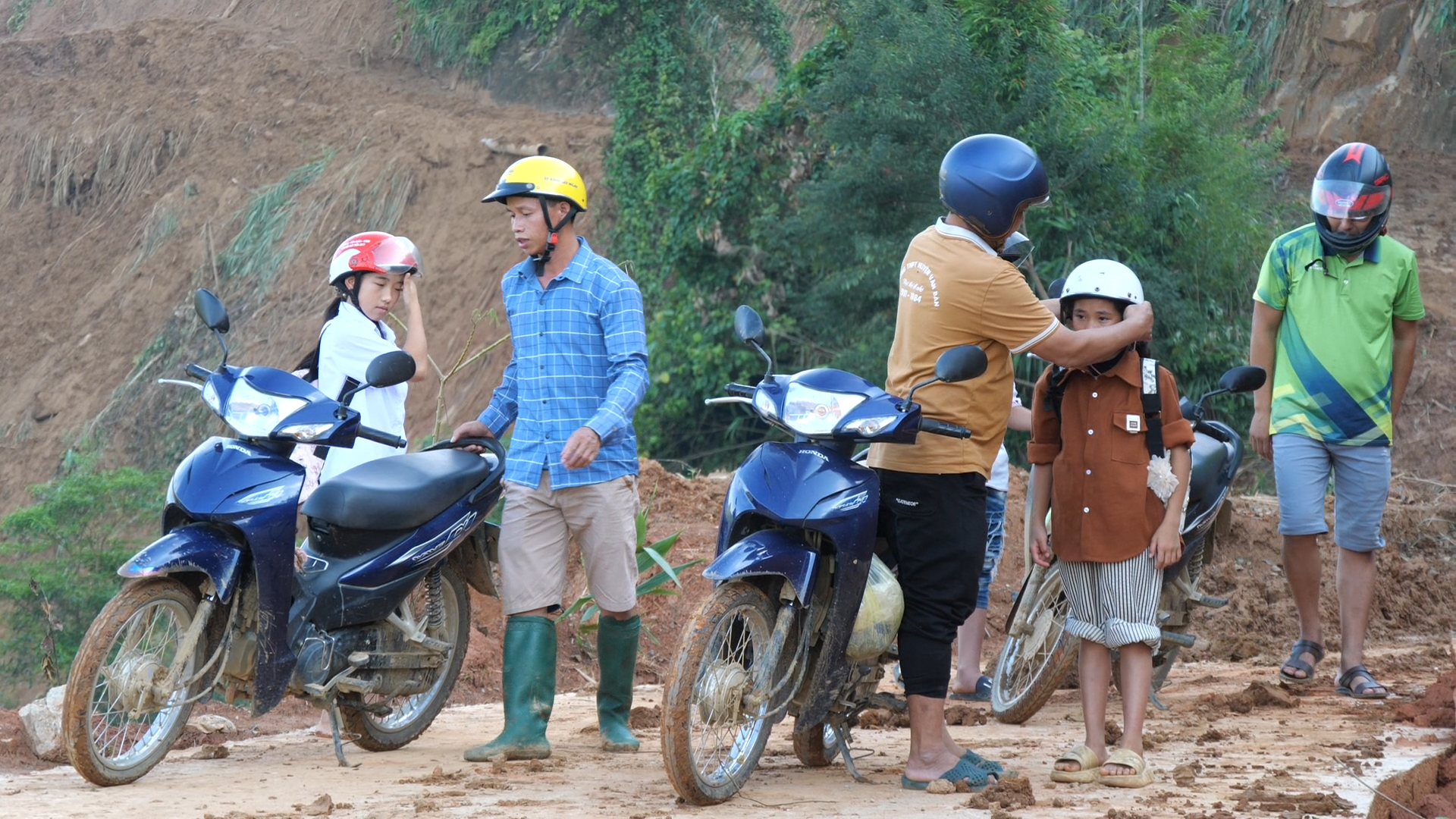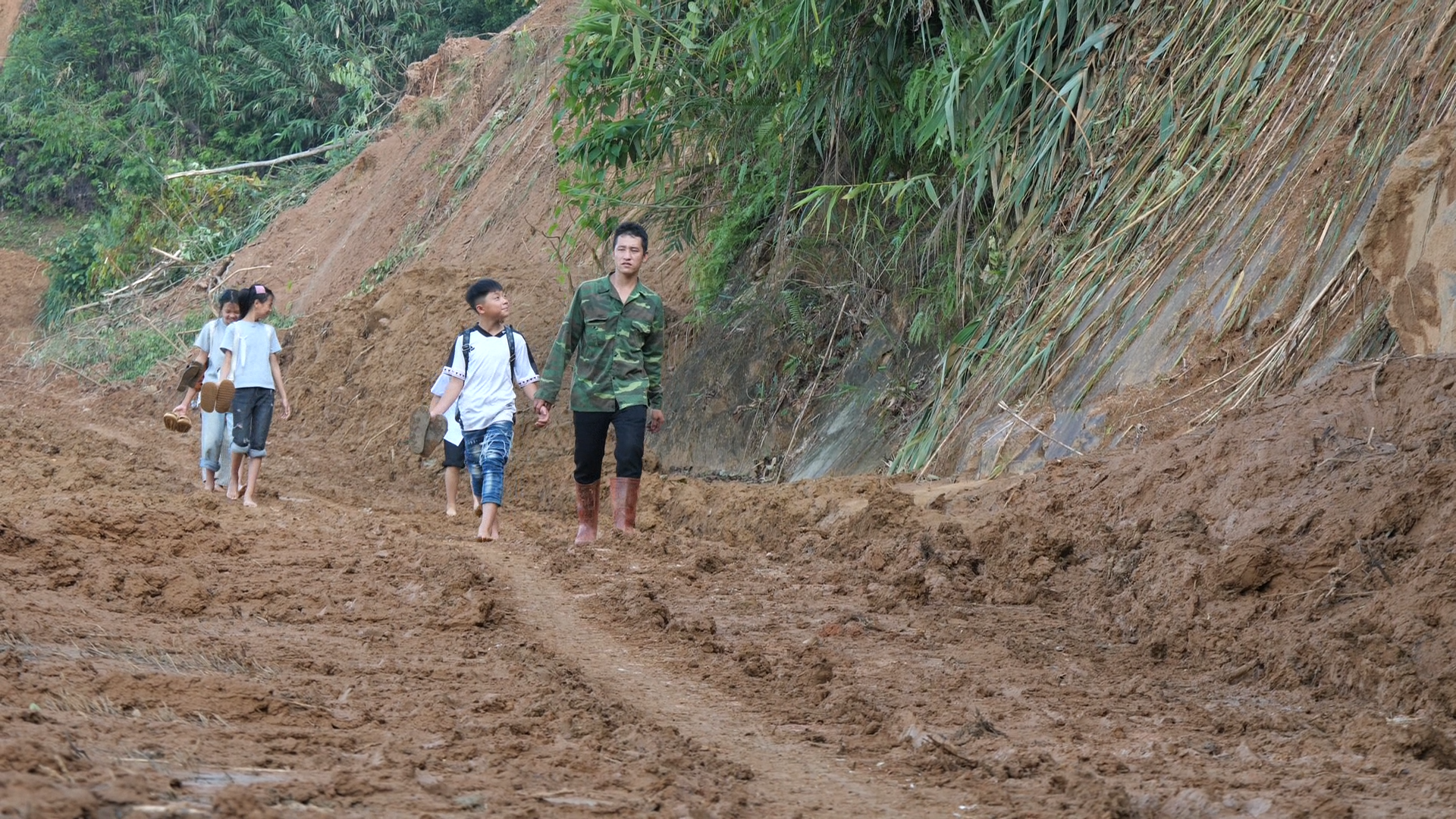 Để ra điểm trường chính, học sinh phải đi bộ 8 km vượt qua hàng chục điểm sạt lở nguy hiểm.