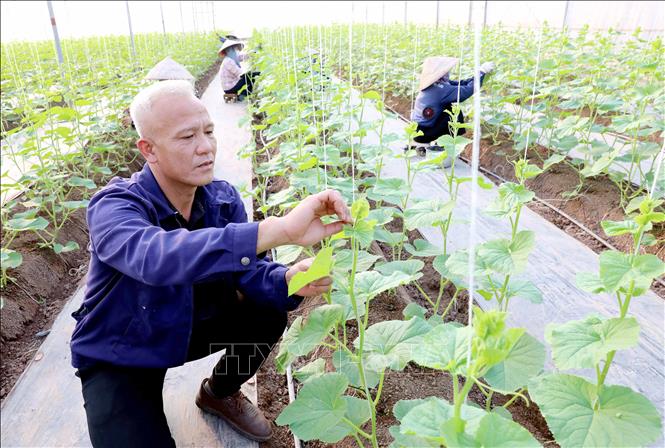 Anh Bùi Văn Phương kiểm tra quá trình sinh trưởng, phát triển của cây dưa chuột. Ảnh: Thế Duyệt/TTXVN