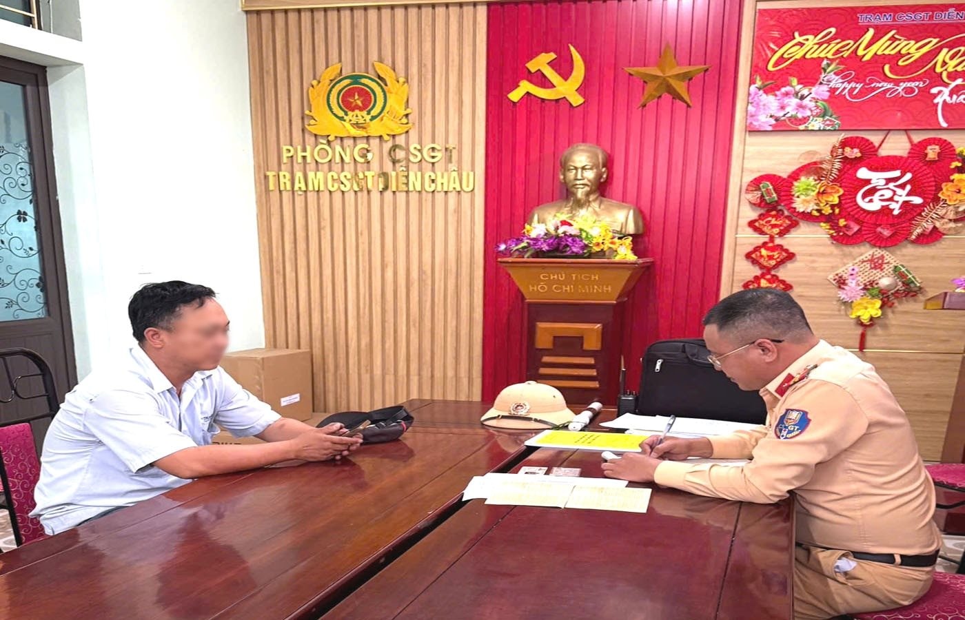 Cán bộ trạm CSGT làm việc, lập biên bản xử lý vi phạm đối với tài xế Đ.V.Đ.