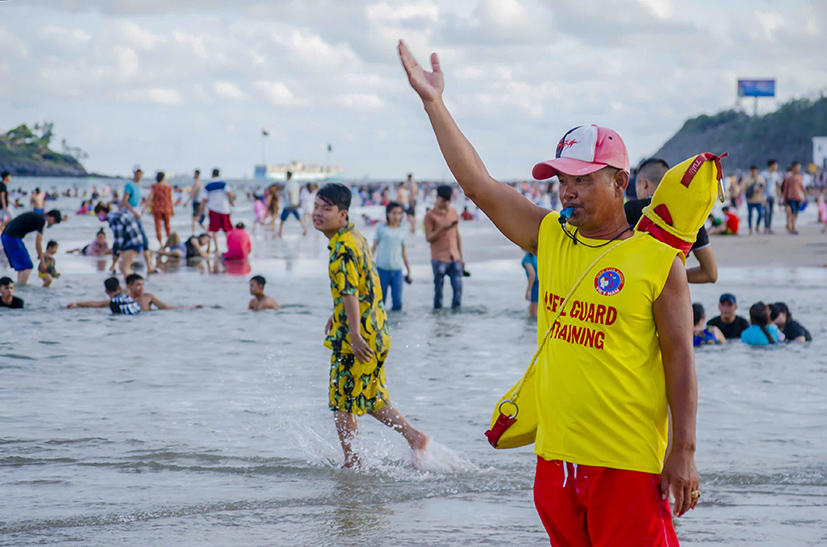 Dầm mình dưới nước, khuôn mặt rám nắng, ông Trần Hữu Bảo Luyện (60 tuổi) vừa thổi còi vừa ngoắc tay ra hiệu cho khách tắm biển di chuyển vào gần bờ, tránh chỗ nước sâu, nguy hiểm. Thấy một tốp khách, trong đó có trẻ em đang xuống biển, ông Luyện dặn dò: “Các anh, chị nên tắm ở chỗ cạn, tránh xa khu vực cắm cờ đen, vì nơi đó có ao xoáy, rất nguy hiểm, đặc biệt là phải trông chừng mấy cháu nhỏ này nhé”.