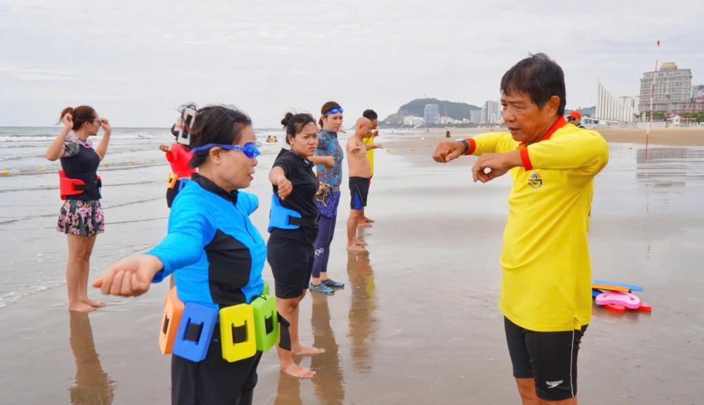 Lực lượng cứu hộ bờ biển hướng dẫn người dân và du khách kỹ năng bơi biển tại Bãi Sau. Ảnh: QUANG VŨ