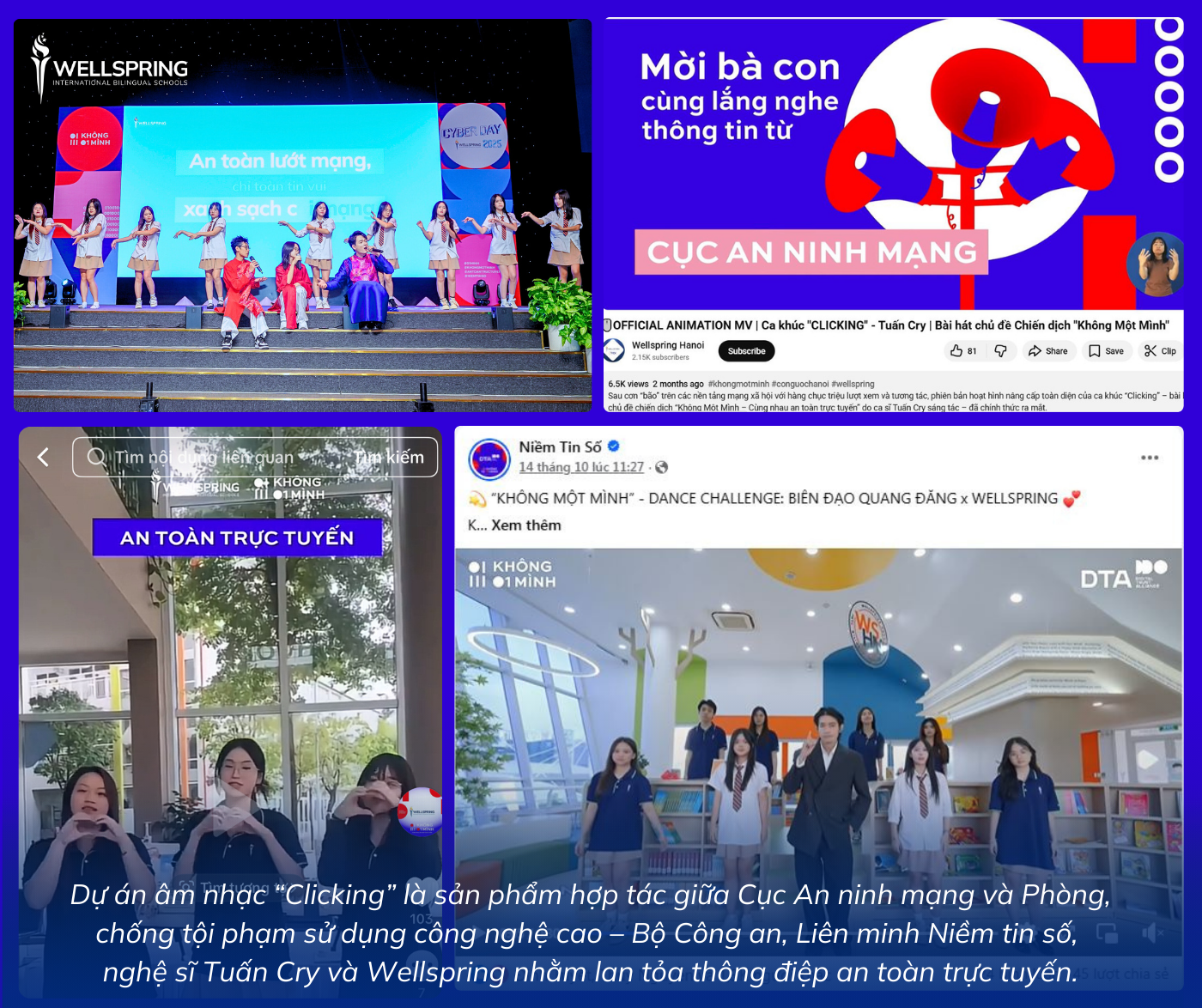 Phát biểu tại Lễ tổng kết chiến dịch “Không Một Mình - Cùng nhau an toàn trực tuyến”, Trung tá Nguyễn Tiến Cường, Trưởng phòng 3, Cục An ninh mạng và phòng, chống tội phạm sử dụng công nghệ cao (Bộ Công an) đánh giá cao vai trò của các nhà trường chủ động đồng hành cùng chiến dịch, trong đó, Trường Phổ thông Liên cấp song ngữ quốc tế Wellspring là một trong những trường tiên phong lan tỏa thông điệp và bài hát Clicking.