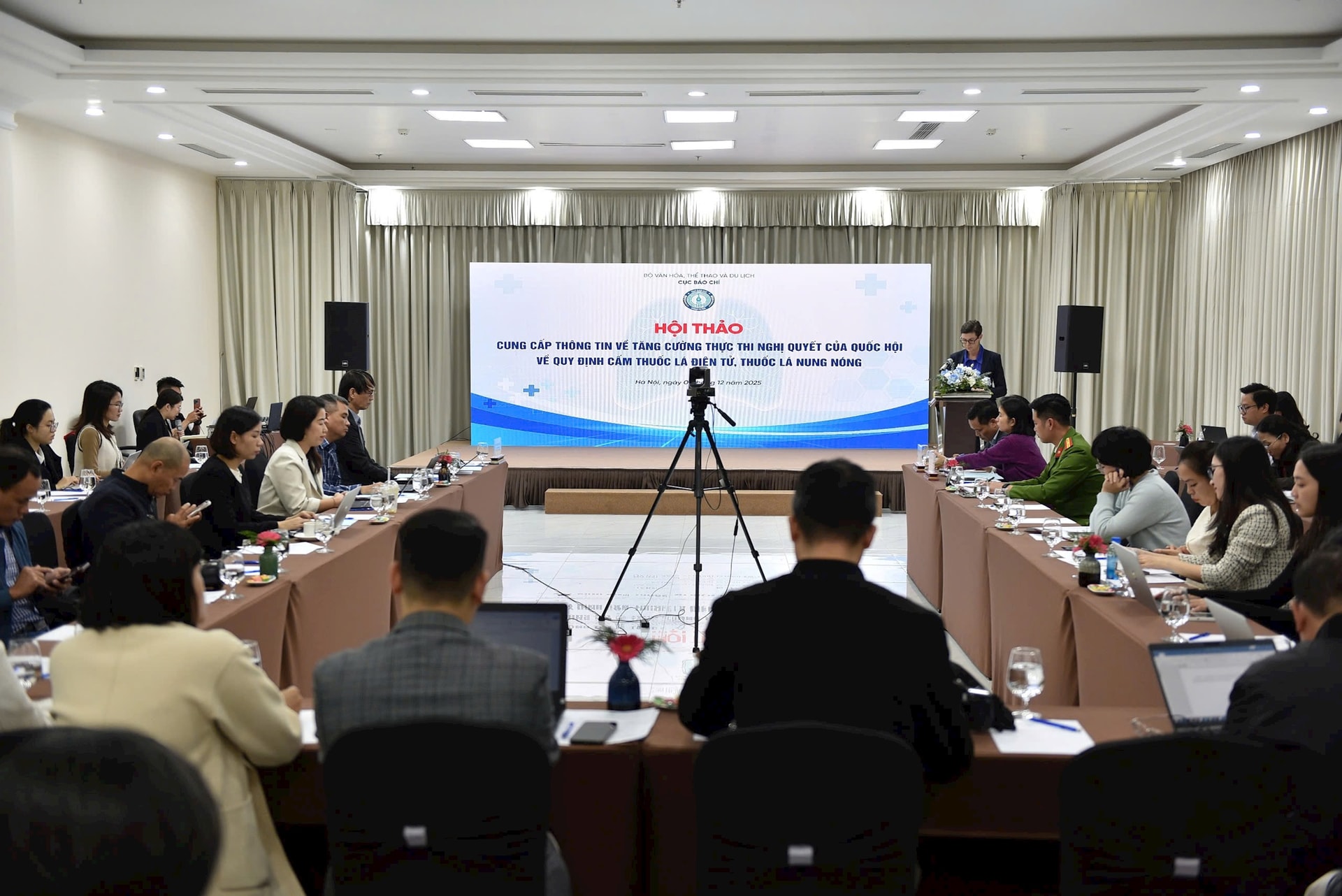 Phát biểu khai mạc hội thảo, Phó Cục trưởng Cục Báo chí (Bộ Văn hóa, Thể thao và Du lịch) Đặng Khắc Lợi cho biết: “Quốc hội đã có Nghị quyết 173 trong đó quy định nội dung thống nhất cấm sản xuất, kinh doanh, nhập khẩu, chứa chấp, vận chuyển, sử dụng thuốc lá điện tử, thuốc lá nung nóng, các loại khí, chất gây nghiện, gây tác hại cho sức khỏe con người từ năm 2025, bảo đảm sức khỏe cộng đồng, trật tự, an toàn xã hội… Đây là quyết định mạnh mẽ, kịp thời và hết sức cần thiết nhằm bảo vệ sức khỏe cộng đồng, đặc biệt là thế hệ trẻ”.