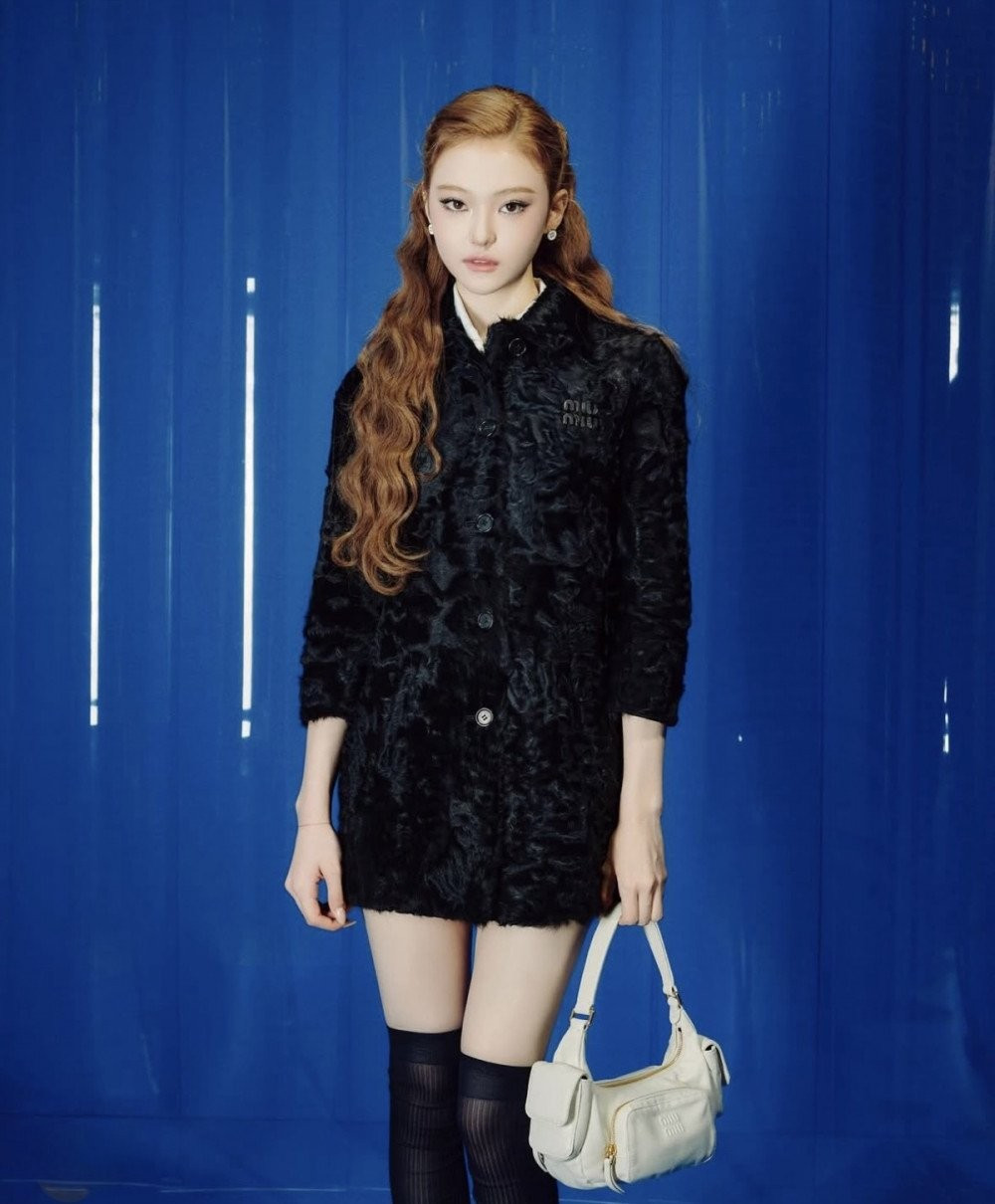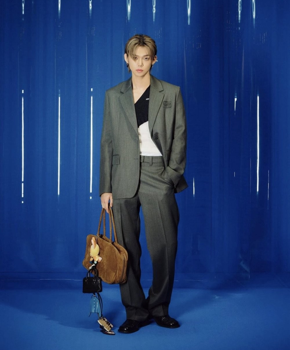 Yeonjun toát lên vẻ sang trọng tự nhiên trong chiếc áo khoác kiểu vét mohair và quần ống đứng, kết hợp cùng chiếc túi nơ da lộn biểu tượng của Miu Miu, tạo nên nét sắc sảo, hiện đại.