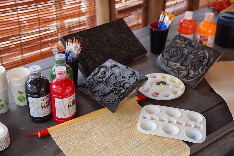 Bộ dụng cụ được chuẩn bị tại khu vực trải nghiệm làm tranh Đông Hồ