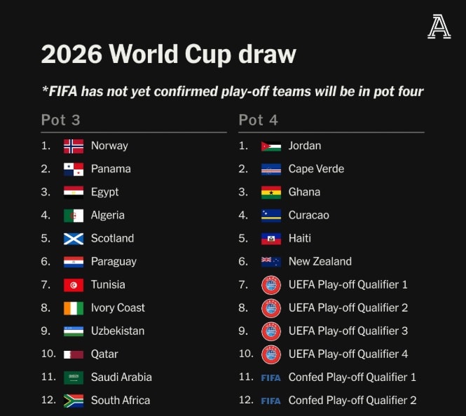 Lễ bốc thăm chia bảng sẽ diễn ra tại Washington D.C vào ngày 5 tháng 12. Kỳ World Cup lần này áp dụng thể thức mới với 48 đội tham dự, được chia thành 12 bảng đấu. Các đội được phân vào 4 nhóm hạt giống dựa trên Bảng xếp hạng FIFA.
