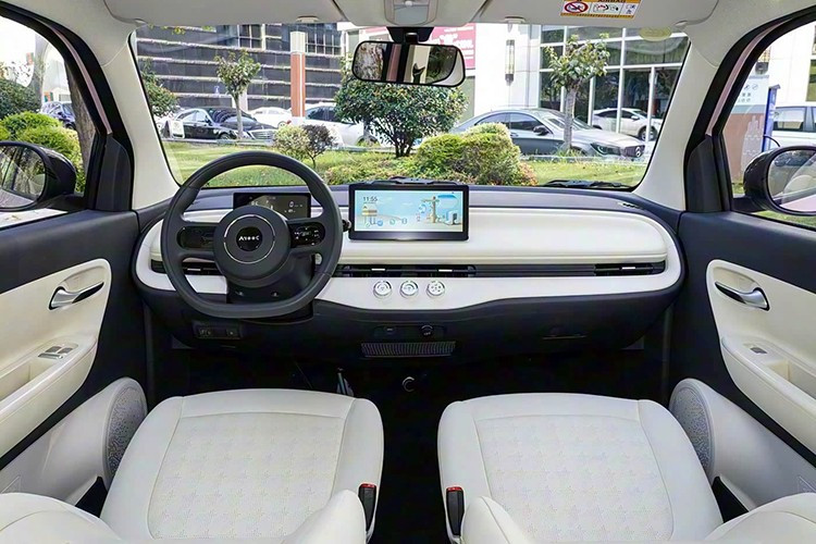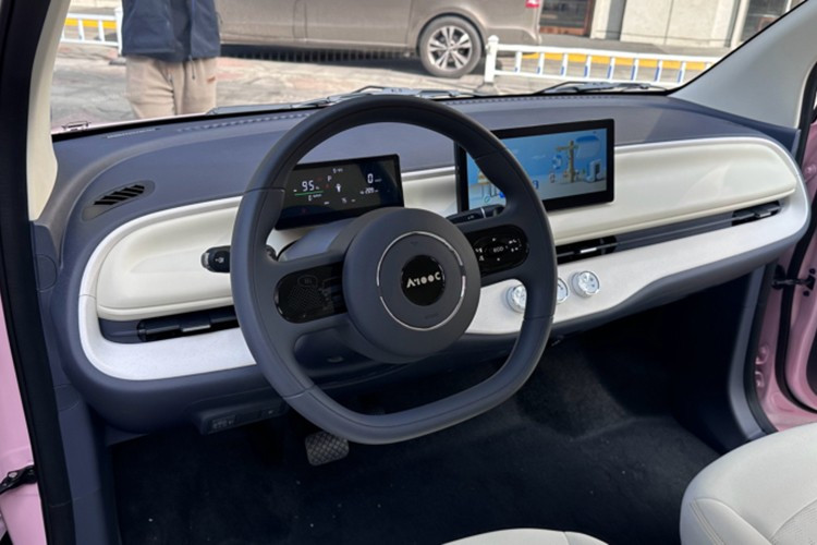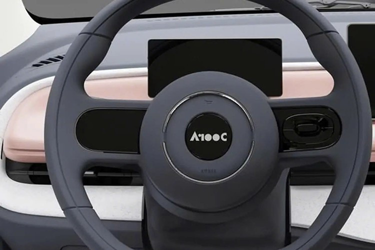Bên trong, A100C chọn cách bố trí tối giản: màn hình cảm ứng đặt nổi trên táp-lô, cụm đồng hồ LCD riêng, và cần số đặt sau vô-lăng hai chấu. Quyết định loại bỏ khu vực bảng điều khiển trung tâm giúp tạo khoảng trống giữa hai ghế trước, tăng độ thoáng thị giác và khoảng duỗi chân – một lợi thế đáng kể trong thân xe ngắn.