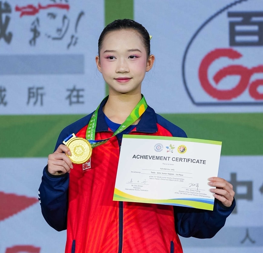 Võ sĩ Chu Tuệ Anh giành HCV thái cực kiếm 42 thức, nhóm tuổi B. Ảnh: TTVN
