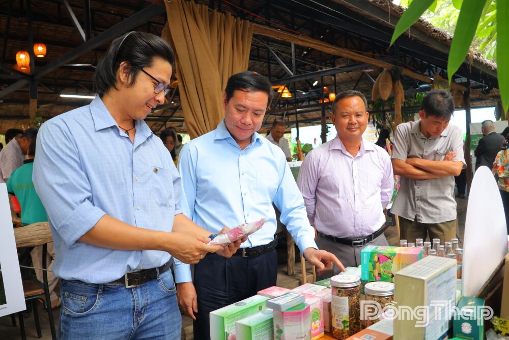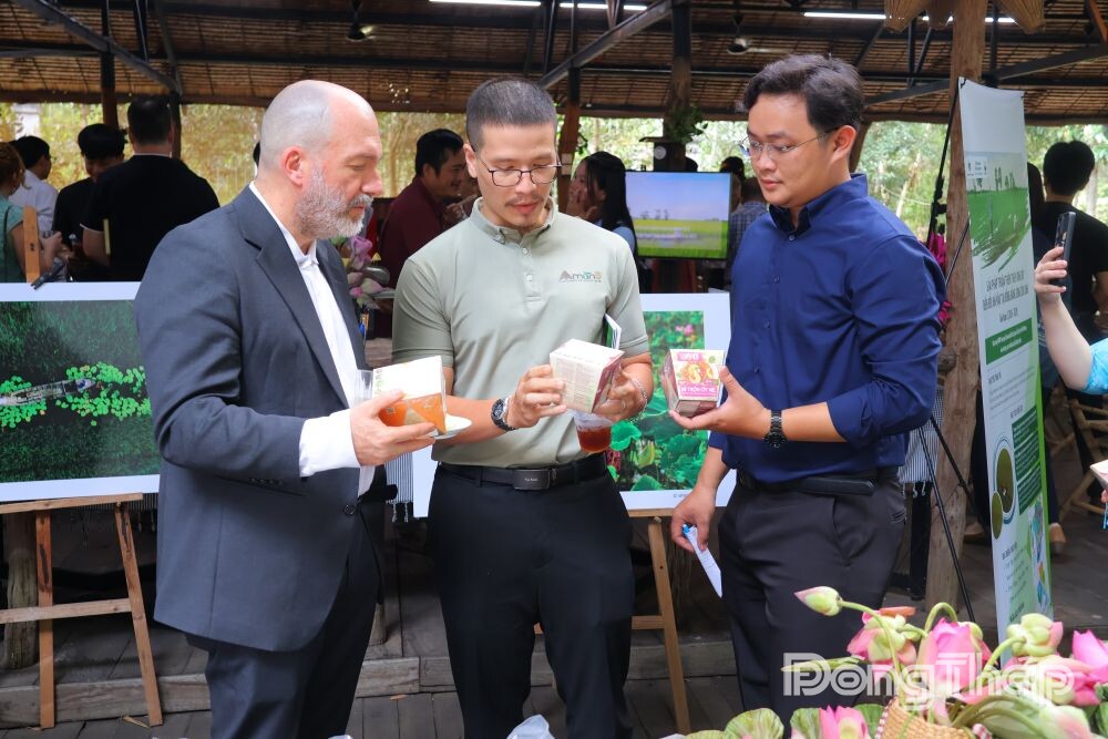 Giám đốc Sở Nông nghiệp và Môi trường tỉnh Đồng Tháp Lê Hà Luân (thứ 2 từ trái sang) cùng các đại biểu tham quan các gian hàng trưng bày sản phẩm nông nghiệp đặc trưng gắn với mô hình sinh kế bền vững trong khuôn khổ dự án.