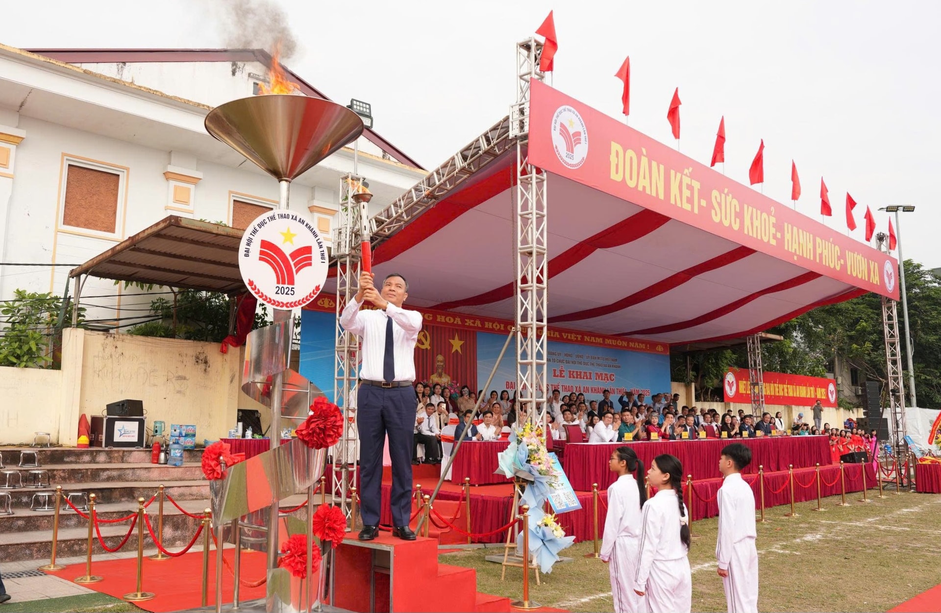 Bí thư Đảng ủy, Chủ tịch HĐND xã An Khánh Nguyễn Trung Thuận tiếp nhận ngọn lửa truyền thống và thắp sáng đài đuốc của Đại hội thể dục - thể thao xã.