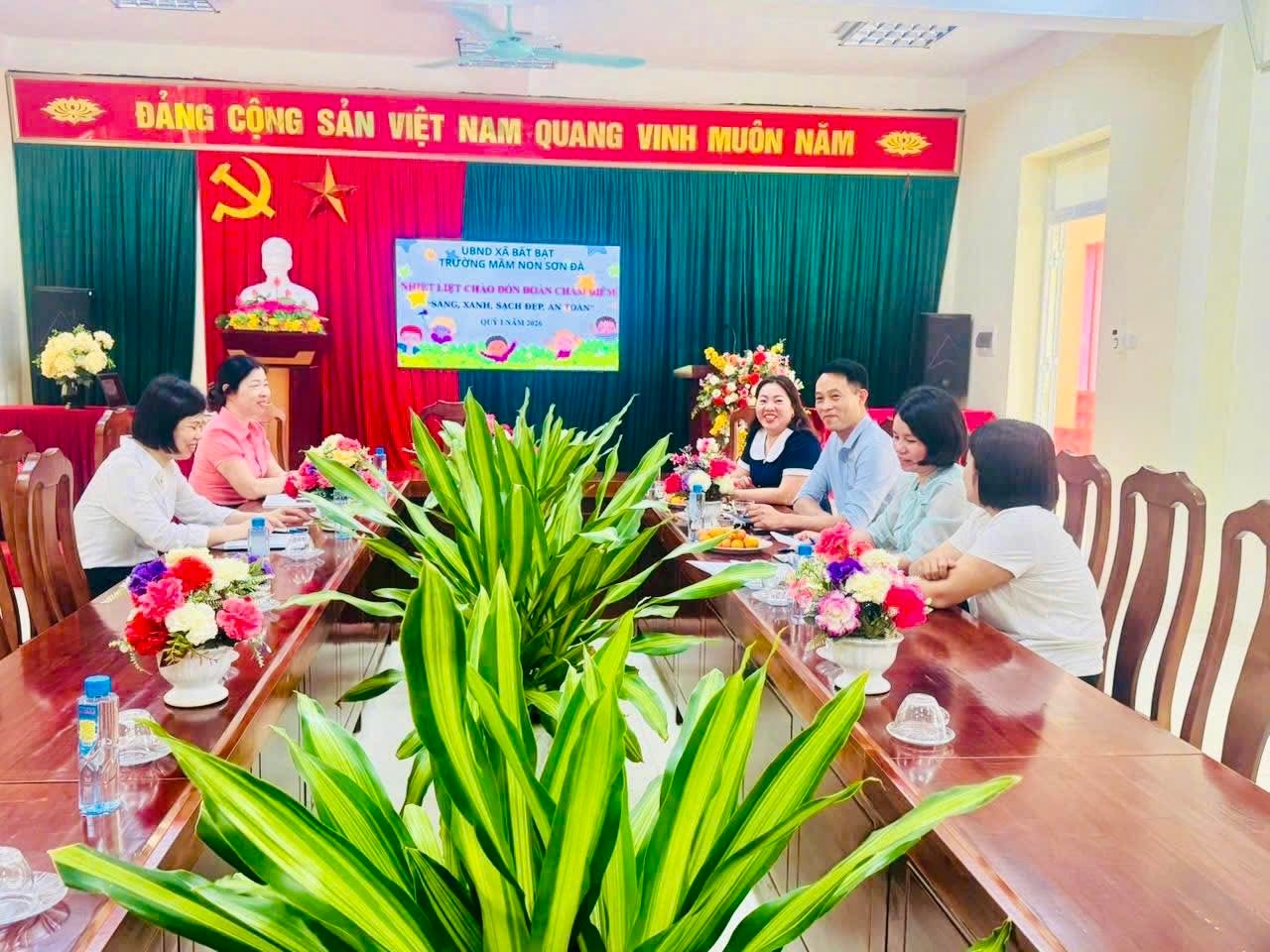 Đoàn kiểm tra cuộc thi “Xây dựng và giữ gìn thôn, xóm, ngõ sáng, xanh, sạch, đẹp, an toàn” năm 2026 chấm điểm tại trường Mầm Non Sơn Đà. Ảnh: KT
