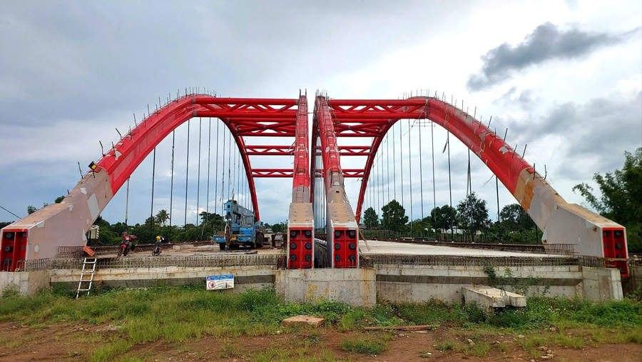 Các đơn vị thi công cầu trên tuyến đường hành lang kinh tế phía Đông tỉnh Gia Lai (đoạn qua xã Biển Hồ). Ảnh: N.D