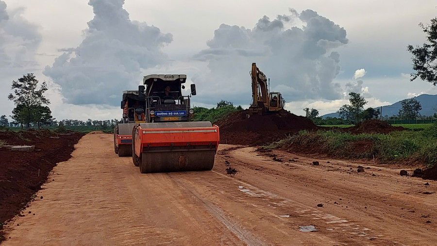 Phương tiện cơ giới tập trung thi công tuyến đường đoạn qua xã Nghĩa Hưng (cũ). Ảnh: N.D