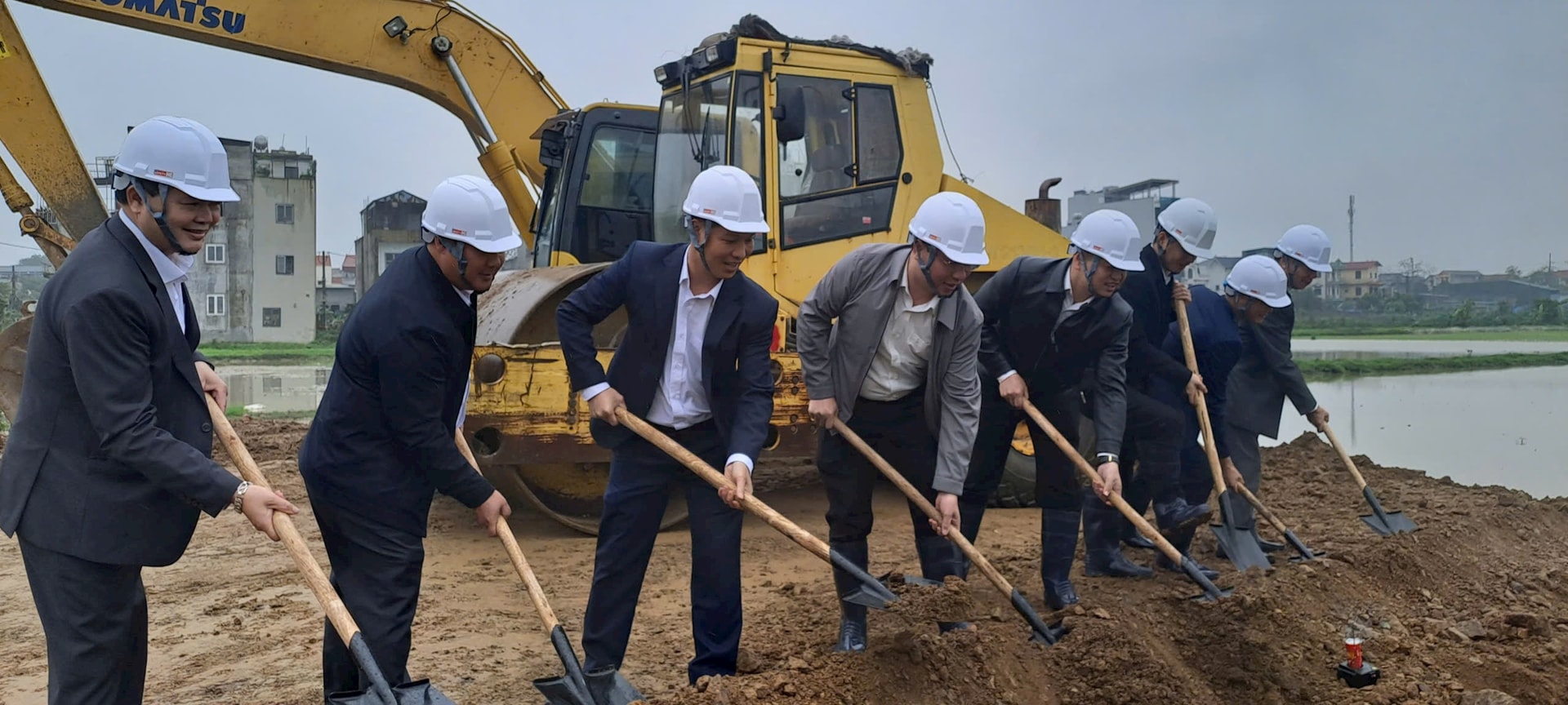 Các đại biểu khởi công dự án xây dựng hạ tầng kỹ thuật đấu giá quyền sử dụng đất tại khu đồng Sau, thôn Thanh Lương. Ảnh: Thành Đạt