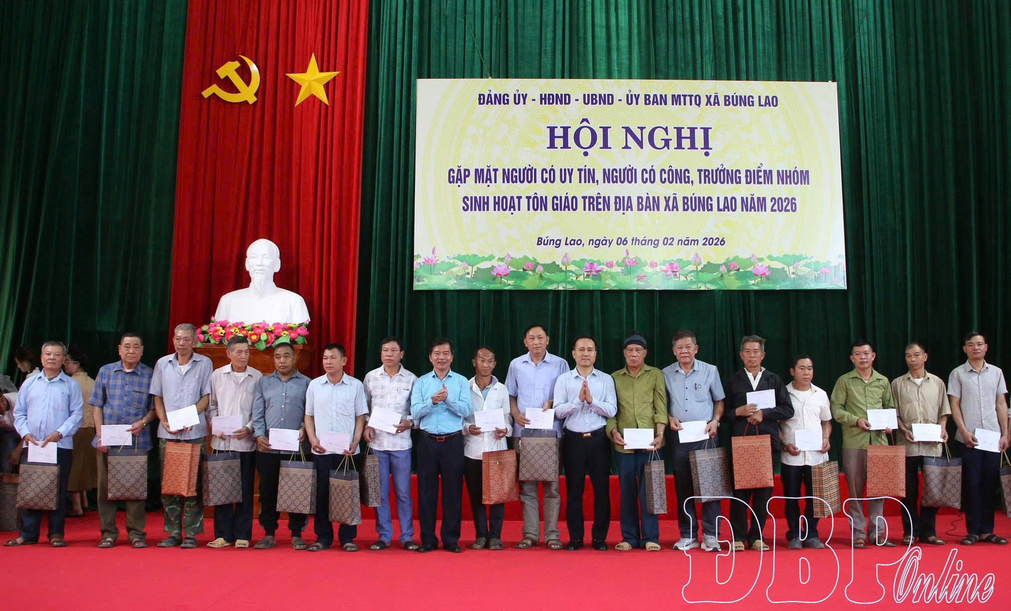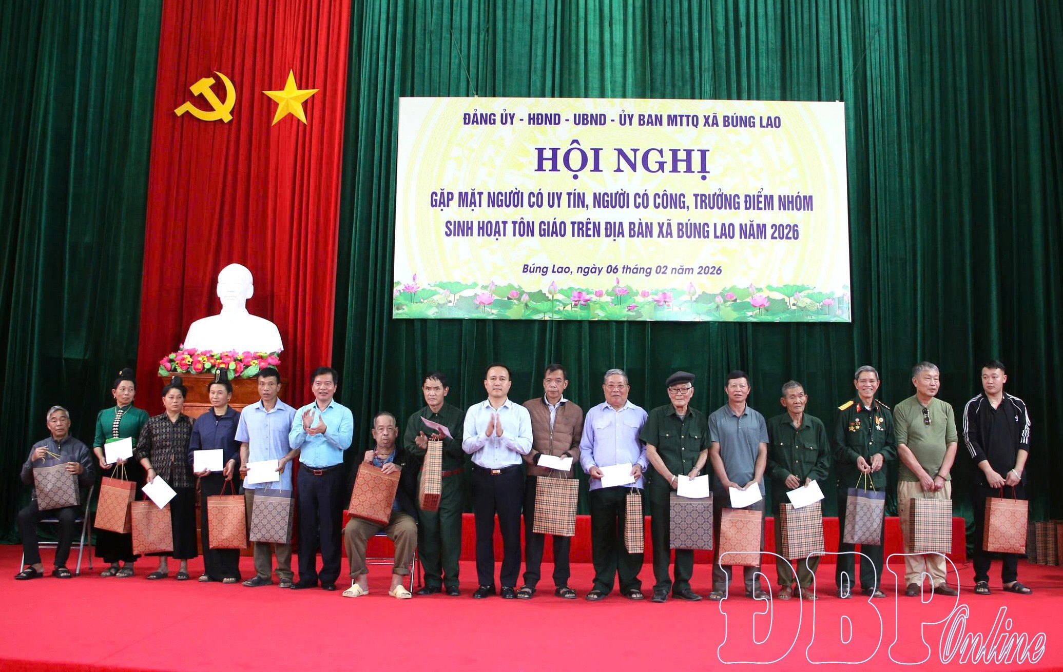 Nhân dịp này, lãnh đạo xã Búng Lao đã chuyển 32 suất quà của Chủ tịch nước đến các gia đình chính sách, tặng 37 suất quà cho người có uy tín, trưởng điểm nhóm sinh hoạt tôn giáo; đồng thời gửi lời chúc mừng năm mới sức khỏe, hạnh phúc đến người có uy tín, trưởng điểm nhóm sinh hoạt tôn giáo cùng các gia đình chính sách, người có công với cách mạng.