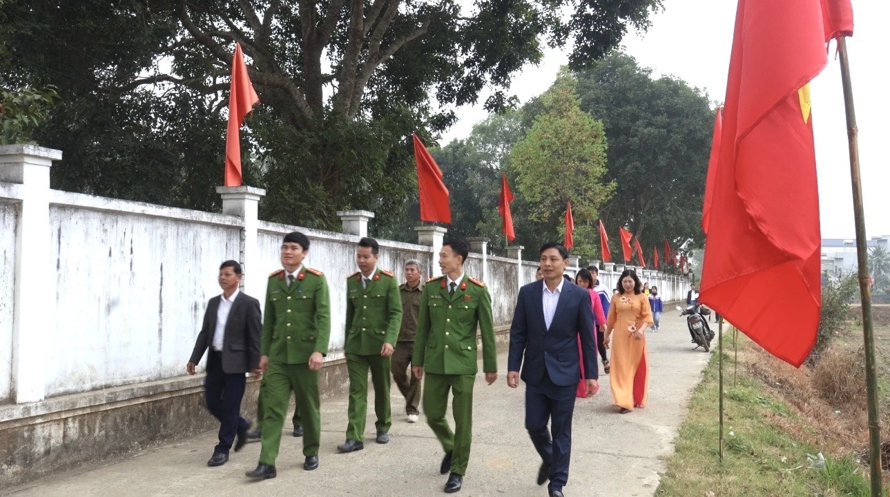 Đại diện lãnh đạo xã và Công an xã Cẩm Thủy tham quan “Đường cờ Tổ quốc”.