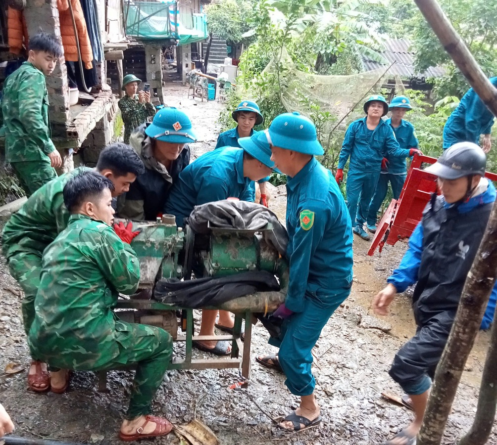 Lực lượng chức năng xã Cần Yên hỗ trợ di dời tài sản của người dân.