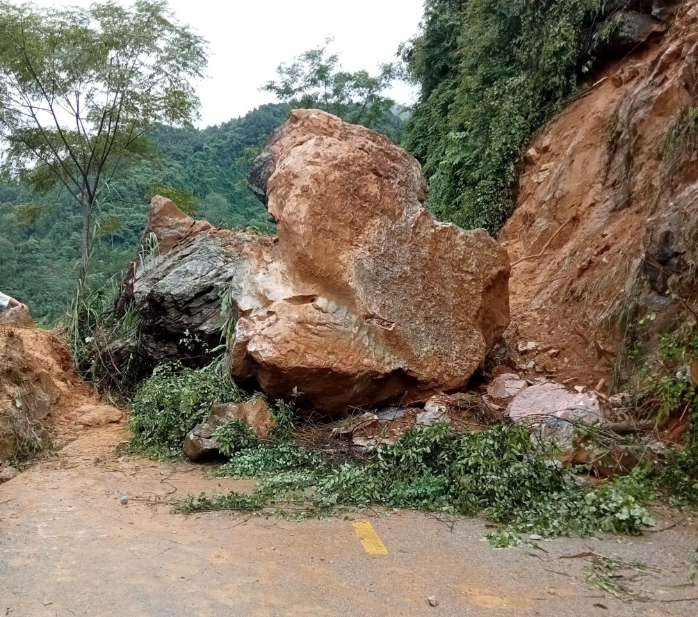 Đá to sạt lở làm tắc Quốc lộ 4A đoạn qua xóm Tả Cáp, xã Cần Yên.