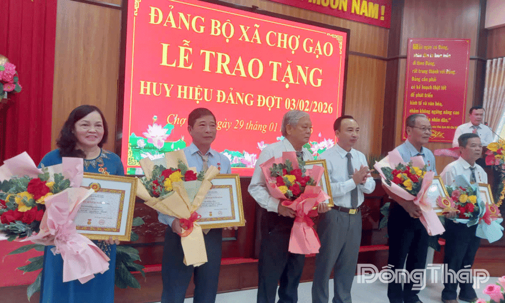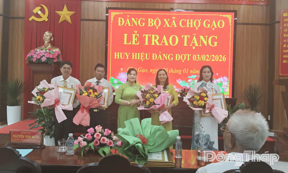 4 Huy hiệu 30 năm tuổi Đảng được trao cho các đảng viên Phạm Thị Hoàng Lan sinh hoạt tại chi bộ Ấp 1; Nguyễn Văn Bé Sáu sinh hoạt chi bộ Ấp 2; Đặng Thị Mỹ Phượng sinh hoạt tại chi bộ ấp Bình An và Nguyễn Chí Hùng sinh hoạt tại chi bộ ấp Bình Hòa A.