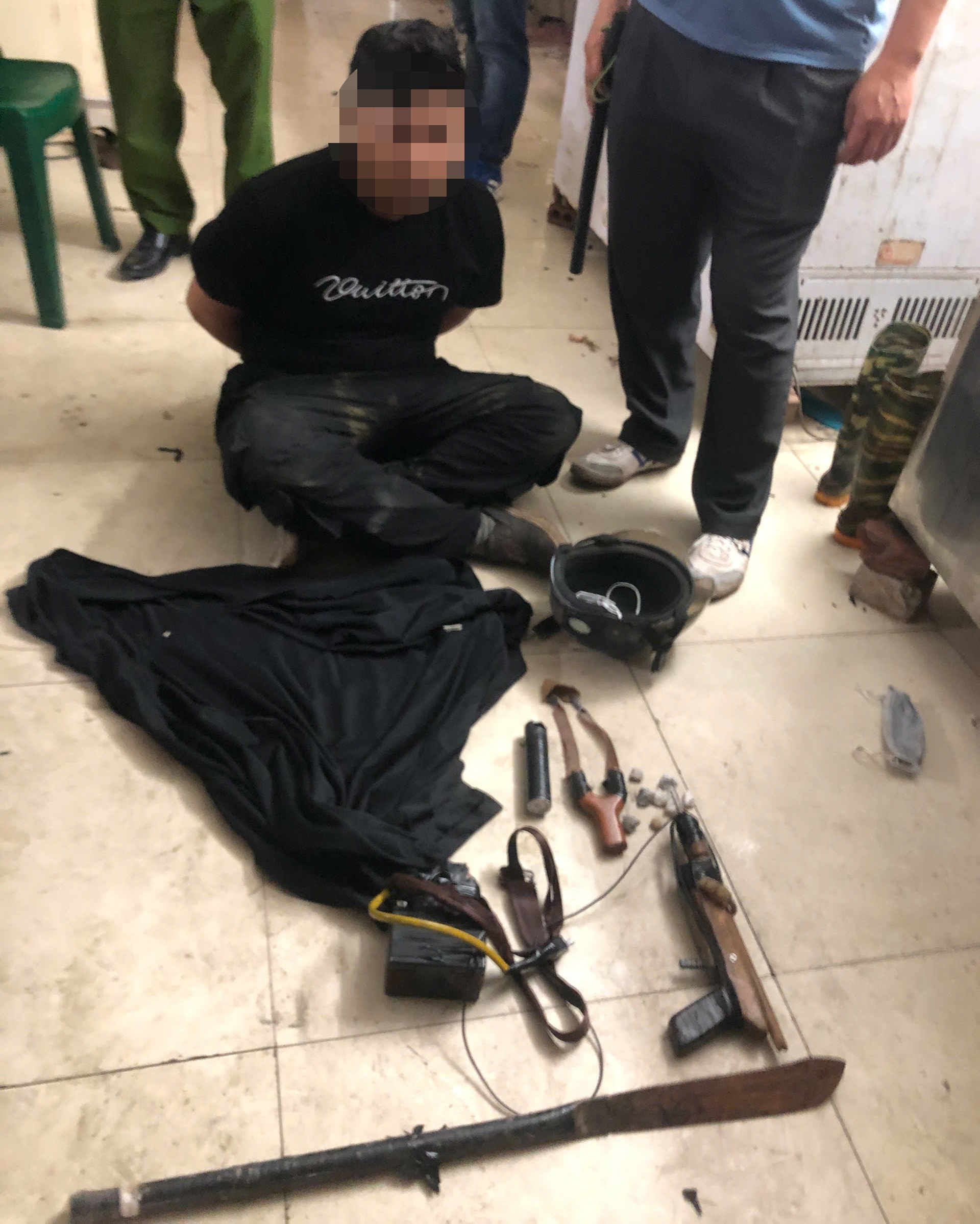 Đối tượng trộm cắp chó bị bắt giữ, cùng các công cụ như thiết bị chích điện, ná cao su, dao quắm
