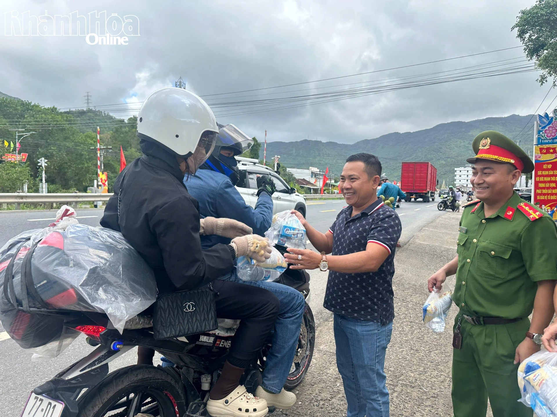 Lực lượng đoàn thanh niên của xã trao quà cho người đi đường.