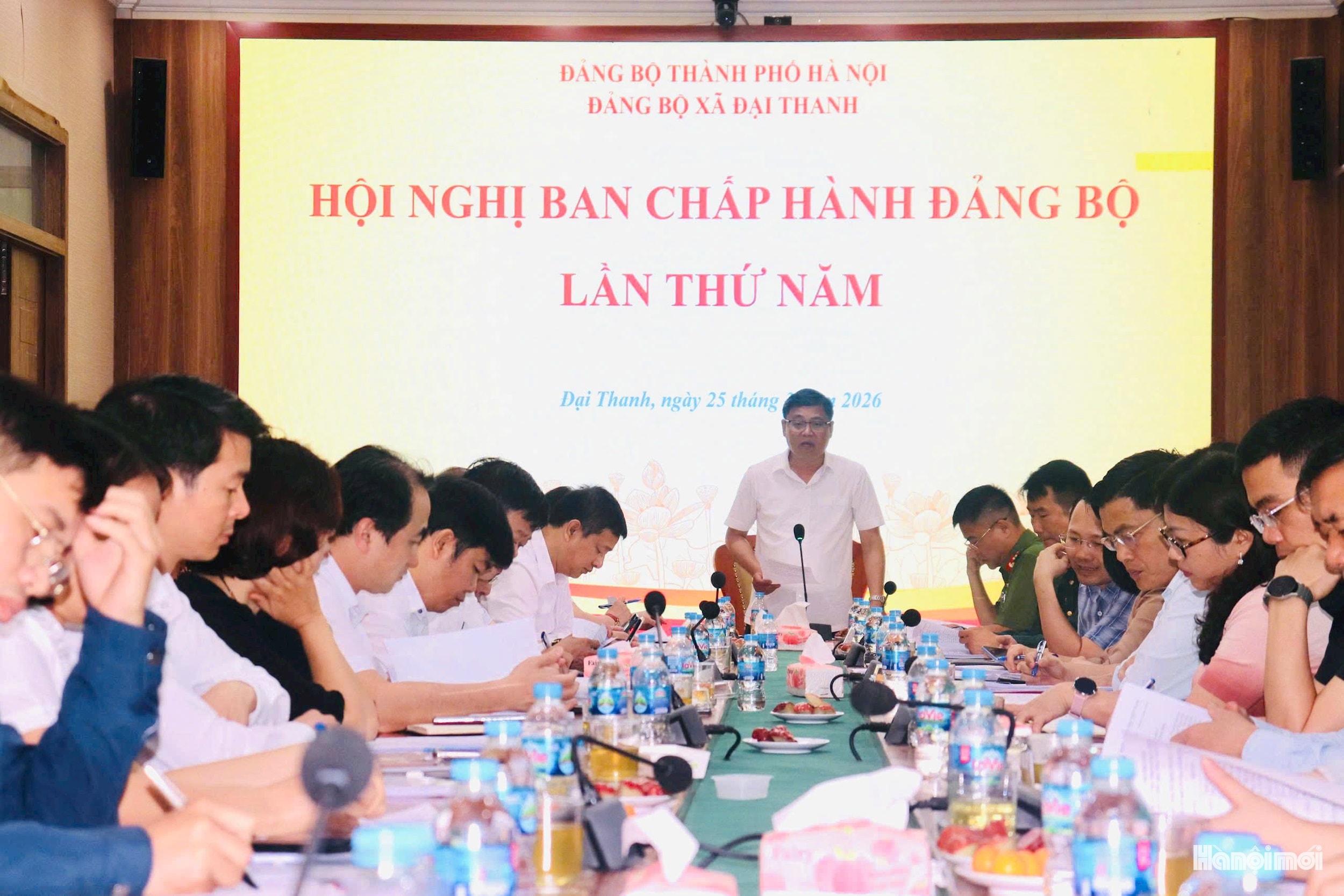 Bí thư Đảng ủy, Chủ tịch HĐND xã Đại Thanh Đặng Đức Quỳnh phát biểu tại hội nghị Ban Chấp hành Đảng bộ xã lần thứ năm, trong đó nhấn mạnh công tác giải phóng mặt bằng để triển khai các dự án trọng điểm là nhiệm vụ quan trọng của xã trong quý II-2026. Ảnh: Đức Chung