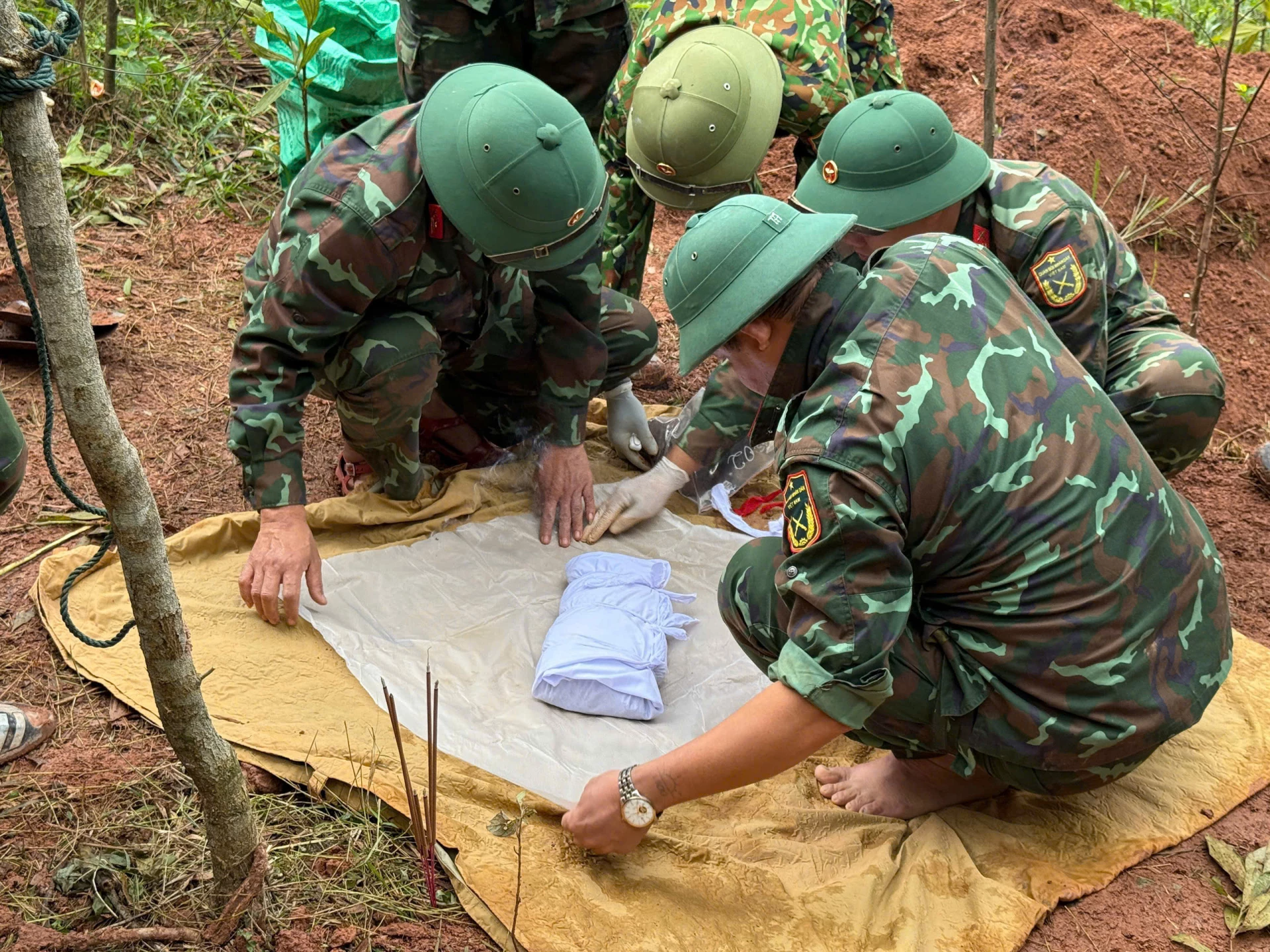 Các thành viên Đội Quy tập hài cốt liệt sĩ 584 thực hiện nghi thức cất bốc hài cốt liệt sĩ để đưa về nơi bảo quản trước khi tổ chức lễ truy điệu - Ảnh: K.S