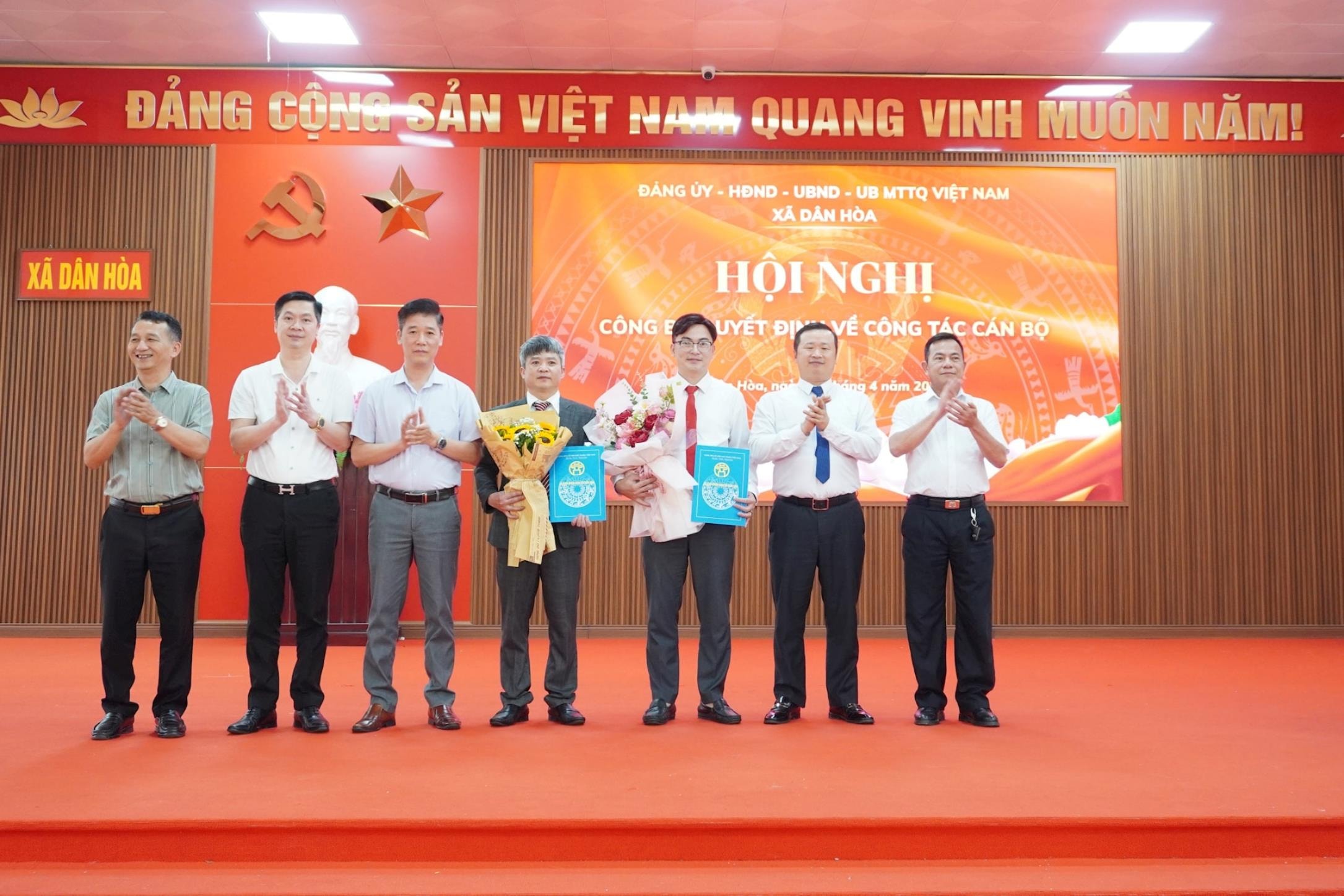 Lãnh đạo xã Dân Hòa trao quyết định và tặng hoa các cán bộ được điều động, bổ nhiệm. Ảnh: Lê Dung.