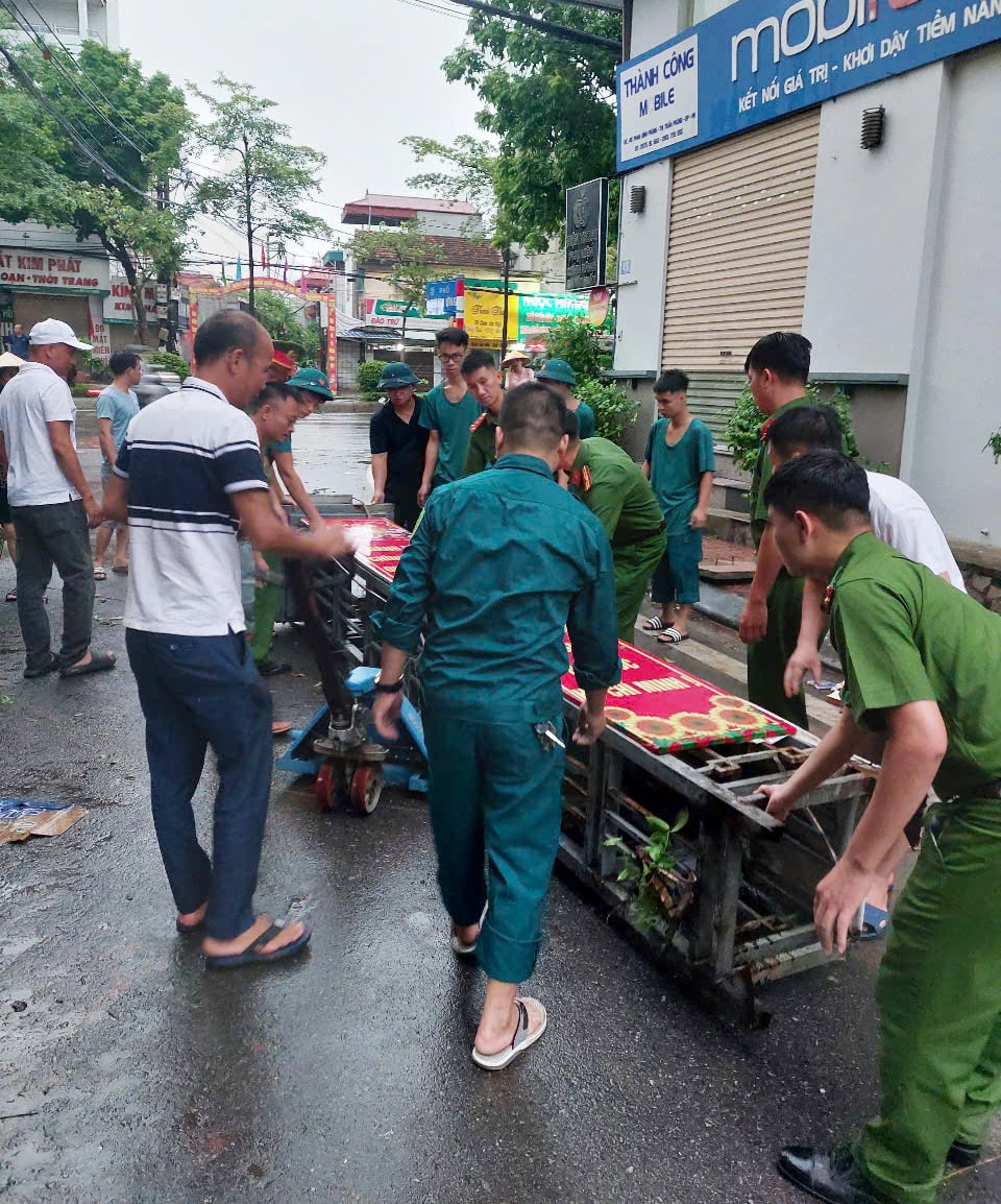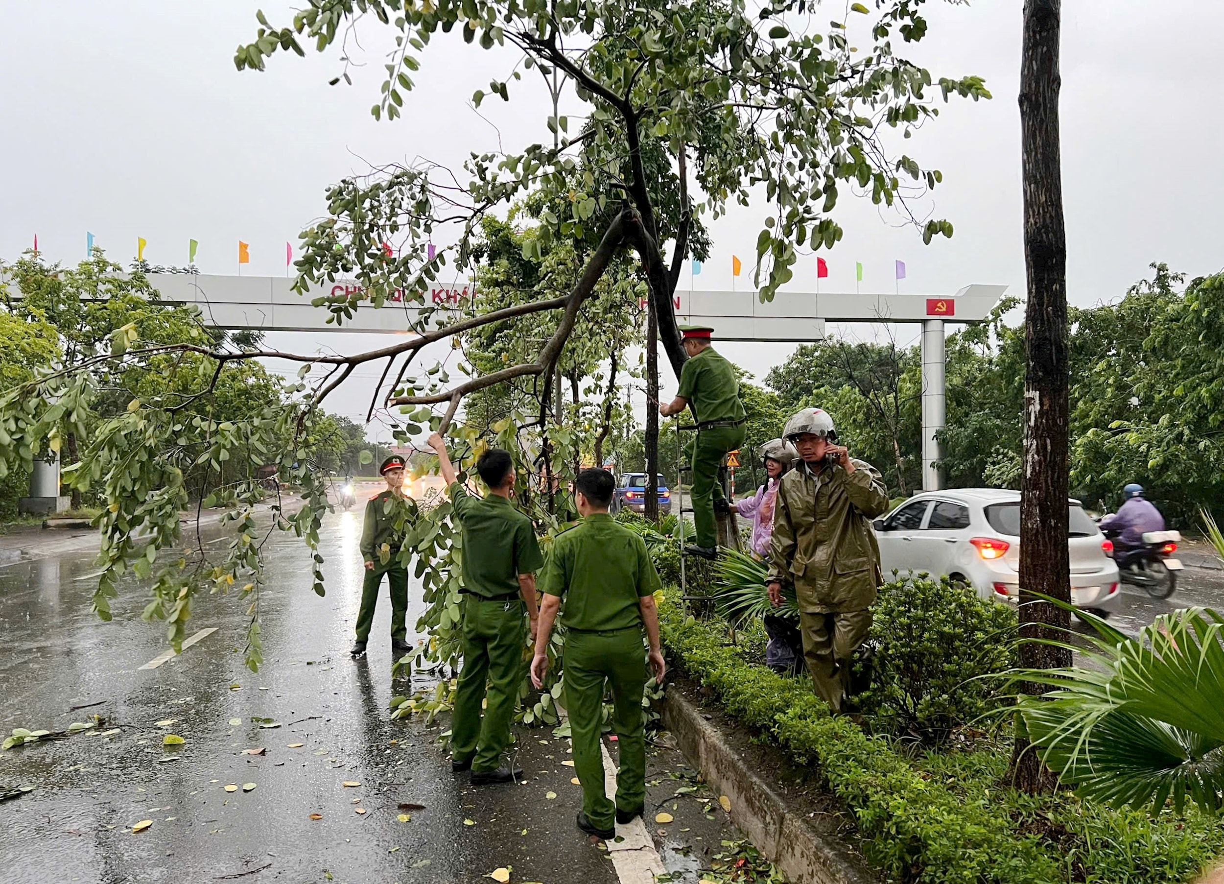 Lực lượng chức năng xã Đan Phượng khắc phục sự cố đổ cổng chào phố Thụy Ứng do mưa giông năm 2025. Ảnh: Minh Đức
