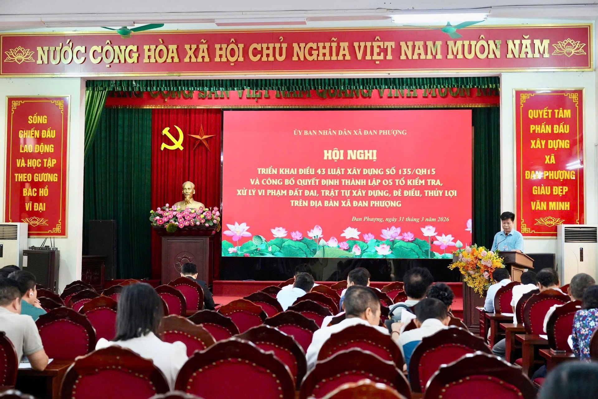Tại hội nghị, Trưởng phòng Kinh tế xã Đan Phượng Nguyễn Đông Hiếu đã thông tin những nội dung cơ bản của Điều 43 Luật Xây dựng số 135/2025/QH15 ngày 10-12-2025 của Quốc hội quy định chung về cấp giấy phép xây dựng. Đồng thời thông qua Quyết định số 444/QĐ-UBND ngày 11-3-2026 của UBND xã Đan Phượng thành lập 5 tổ kiểm tra, xử lý vi phạm đất đai, trật tự xây dựng, đê điều, thủy lợi trên địa bàn xã.