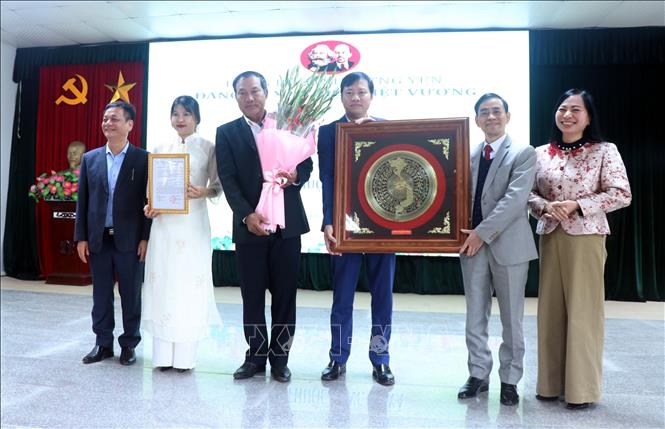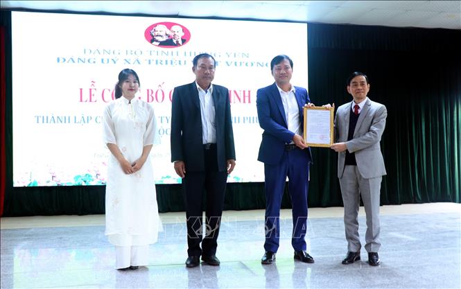 Lãnh đạo xã Triệu Việt Vương chúc mừng Chi bộ Công ty cổ phần Minh Phúc Gold. Ảnh: Mạnh Khánh/TTXVN