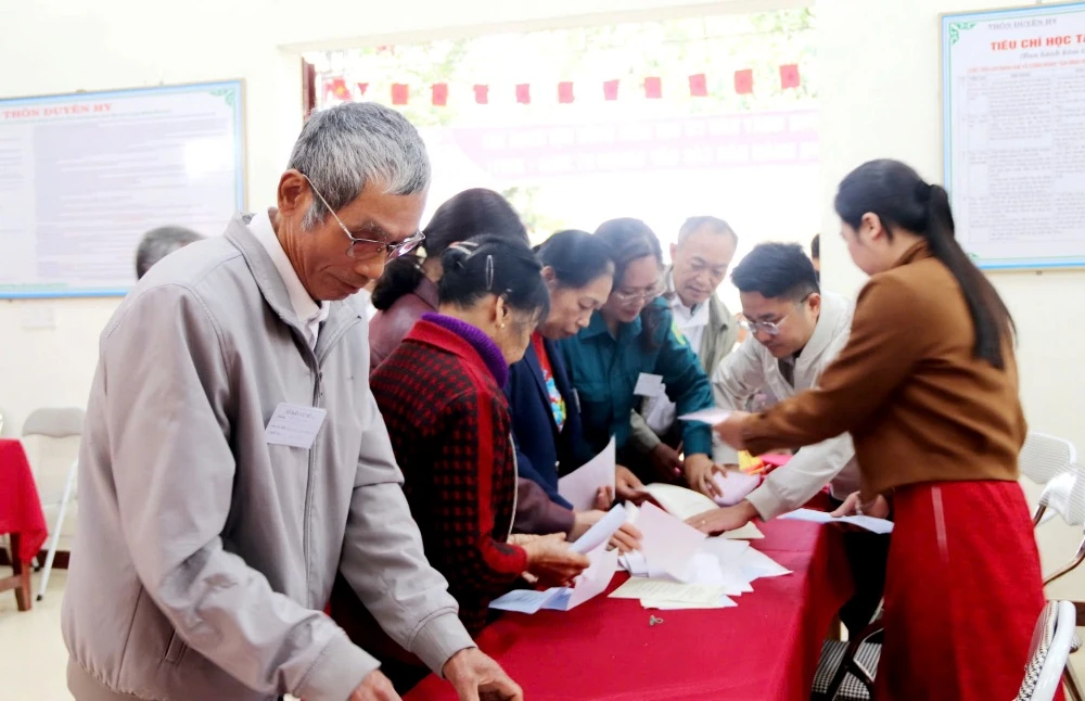Tổ bầu cử số 2 thôn Duyên Hy kiểm tra hòm phiếu trước sự chứng kiến của cử tri.