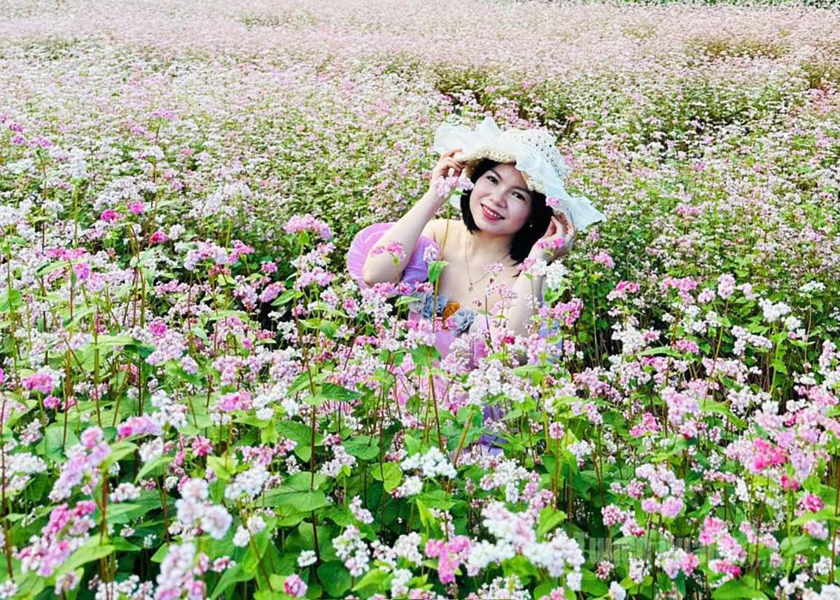 Du khách thích thú với vẻ đẹp thơ mộng của cánh đồng hoa Tam giác mạch.