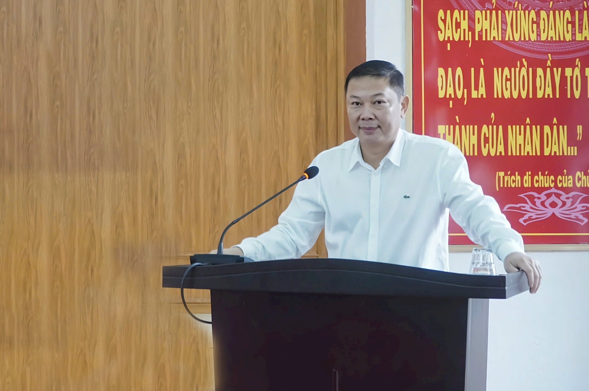 Đồng chí Phạm Thanh, Tỉnh ủy viên, Bí thư Đảng ủy Đức Lập phát biểu chúc mừng các đảng viên đã được nhận Huy hiệu Đảng