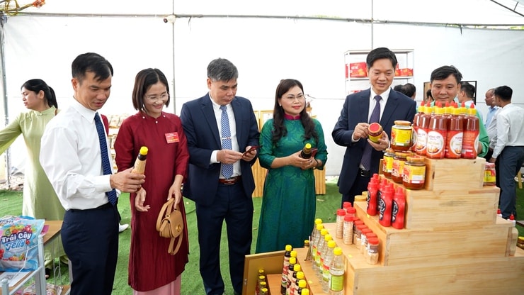 Các đồng chí lãnh đạo xã tham quan các gian hàng trưng bày các sản phẩm địa phương. Ảnh: PV