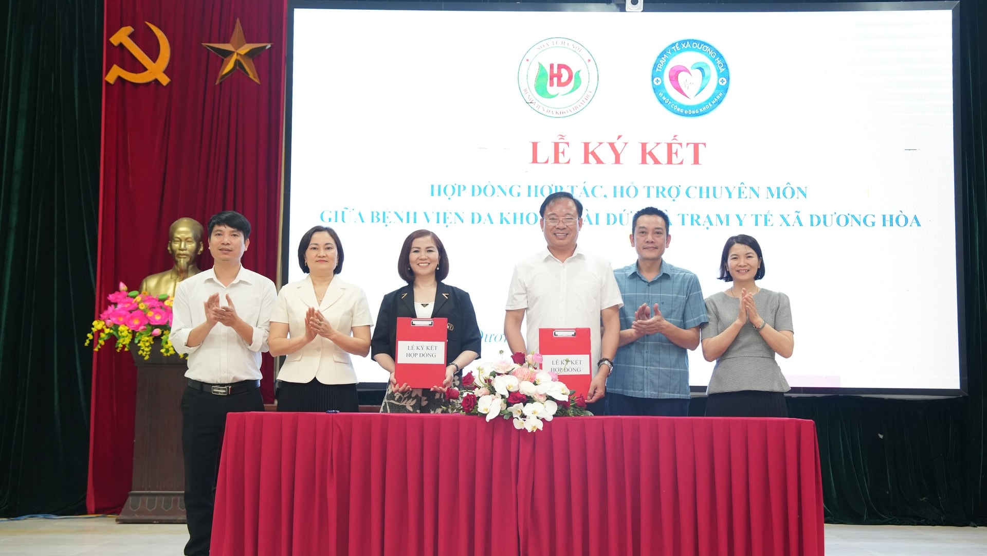 Bệnh viện Đa khoa Hoài Đức và Trạm Y tế xã Dương Hòa ký kết hợp tác. Ảnh: PV
