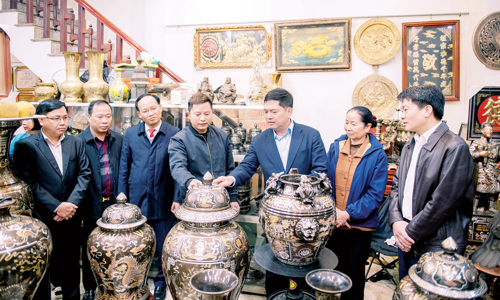 Bí thư Tỉnh ủy Nguyễn Hồng Thái và các đồng chí lãnh đạo tỉnh, xã Gia Bình thăm làng nghề đúc đồng Đại Bái.