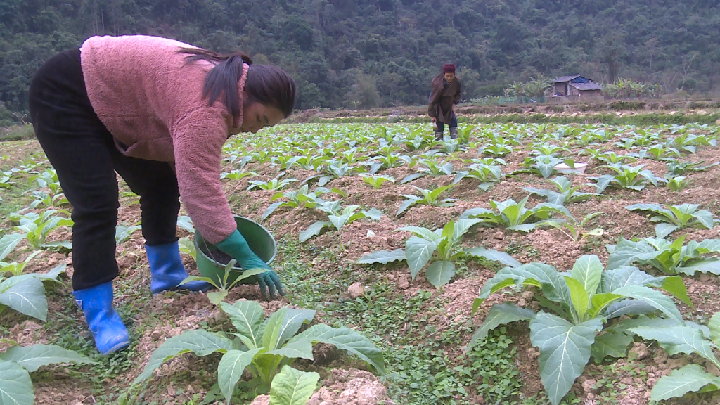 Hiện nay, cây thuốc lá đang bước vào thời kỳ vun xới, bà con tranh thủ ra đồng làm cỏ, bón phân, vun gốc giúp cây phát triển đồng đều.