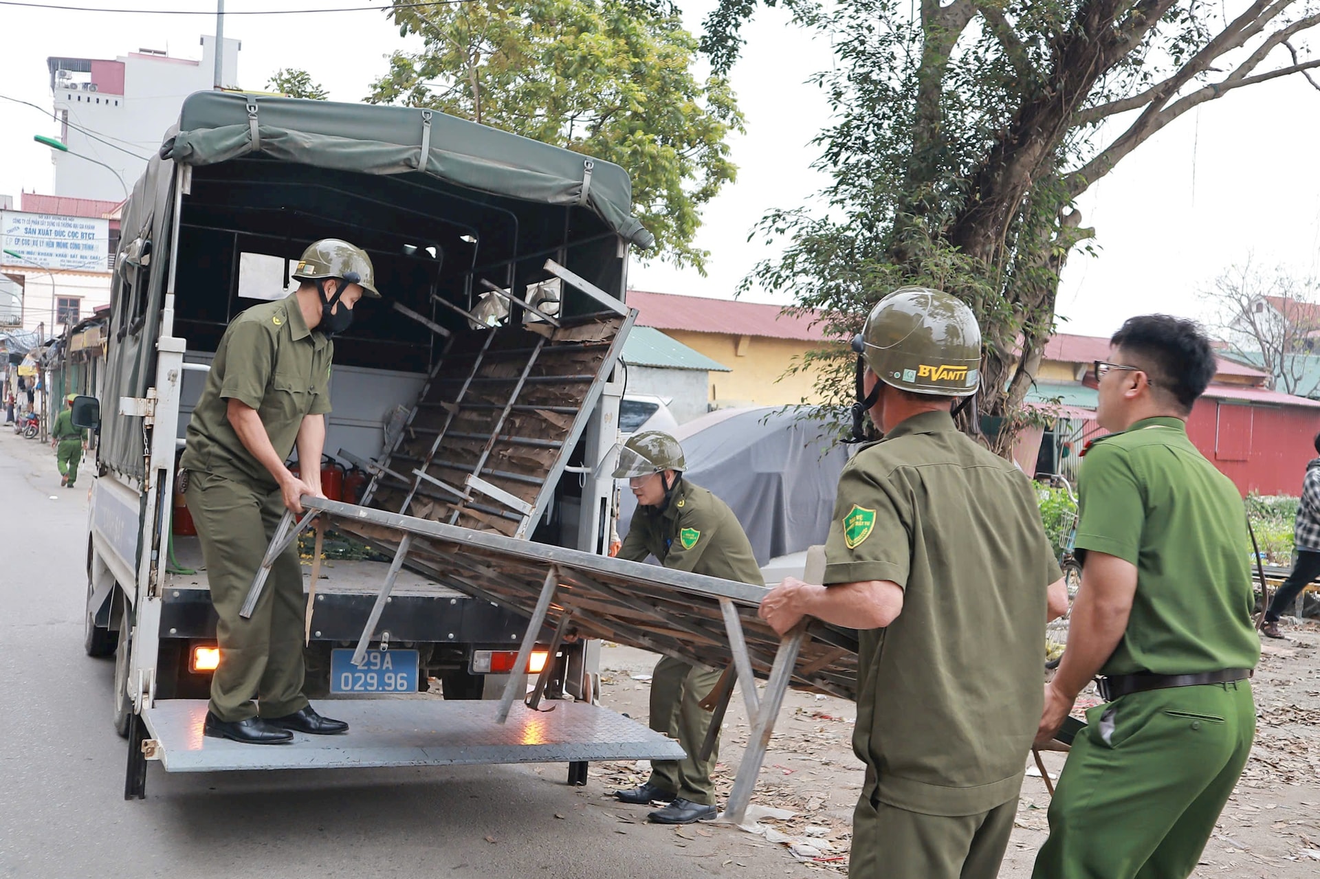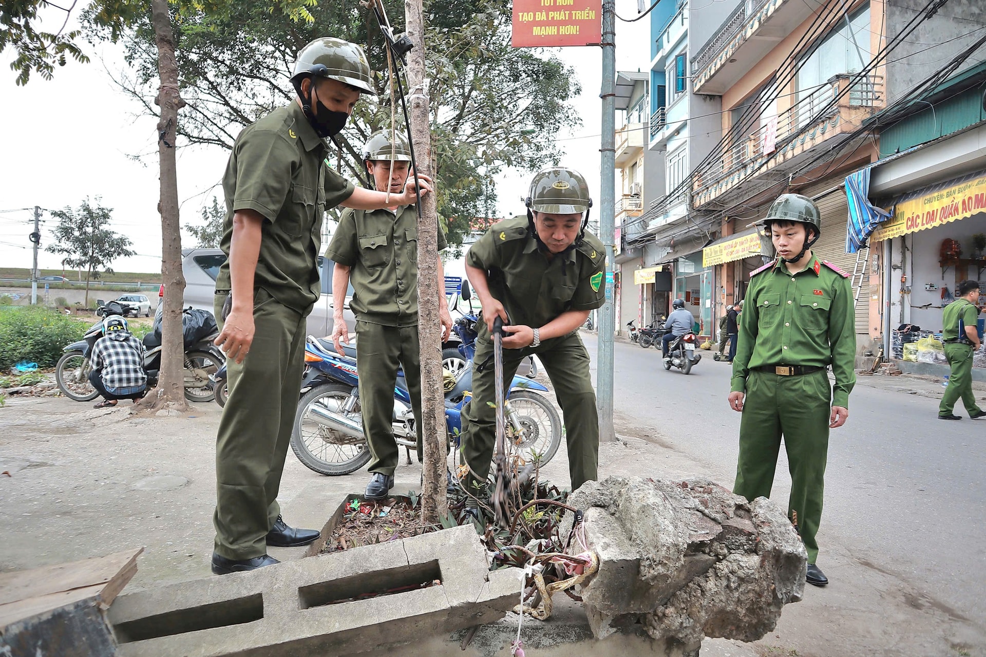 Công an và các lực lượng xã Hát Môn ra quân xử lý các vi phạm về trật tự đô thị trong ngày 20-3. Ảnh: Nguyễn Mai