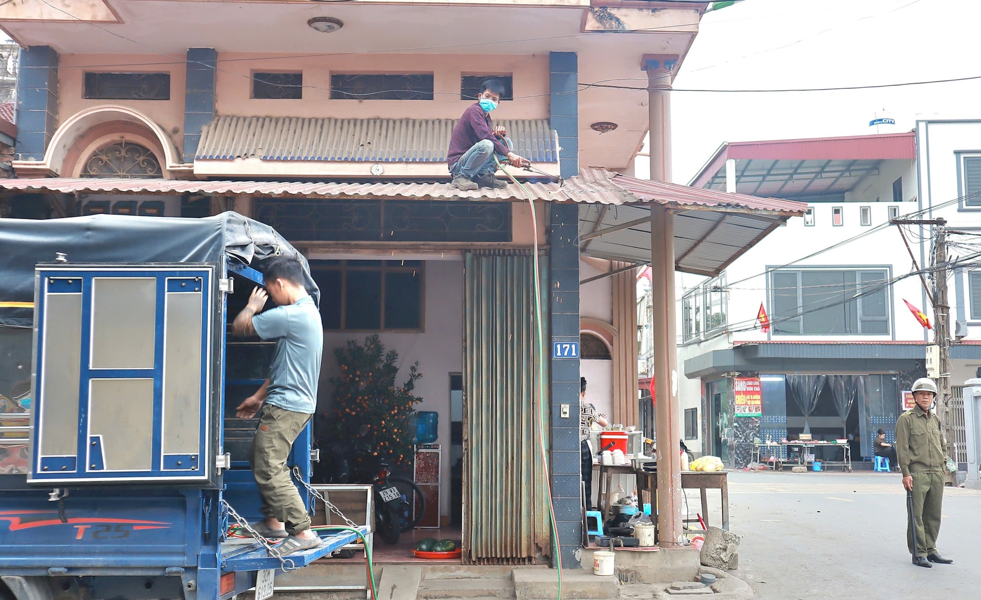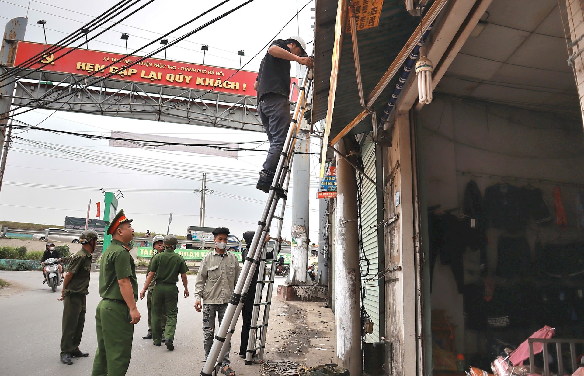 Các lực lượng chức năng tháo dỡ mái che, mái vẩy chìa ra đường giao thông khu vực Tam Hiệp. Ảnh: Nguyễn Mai